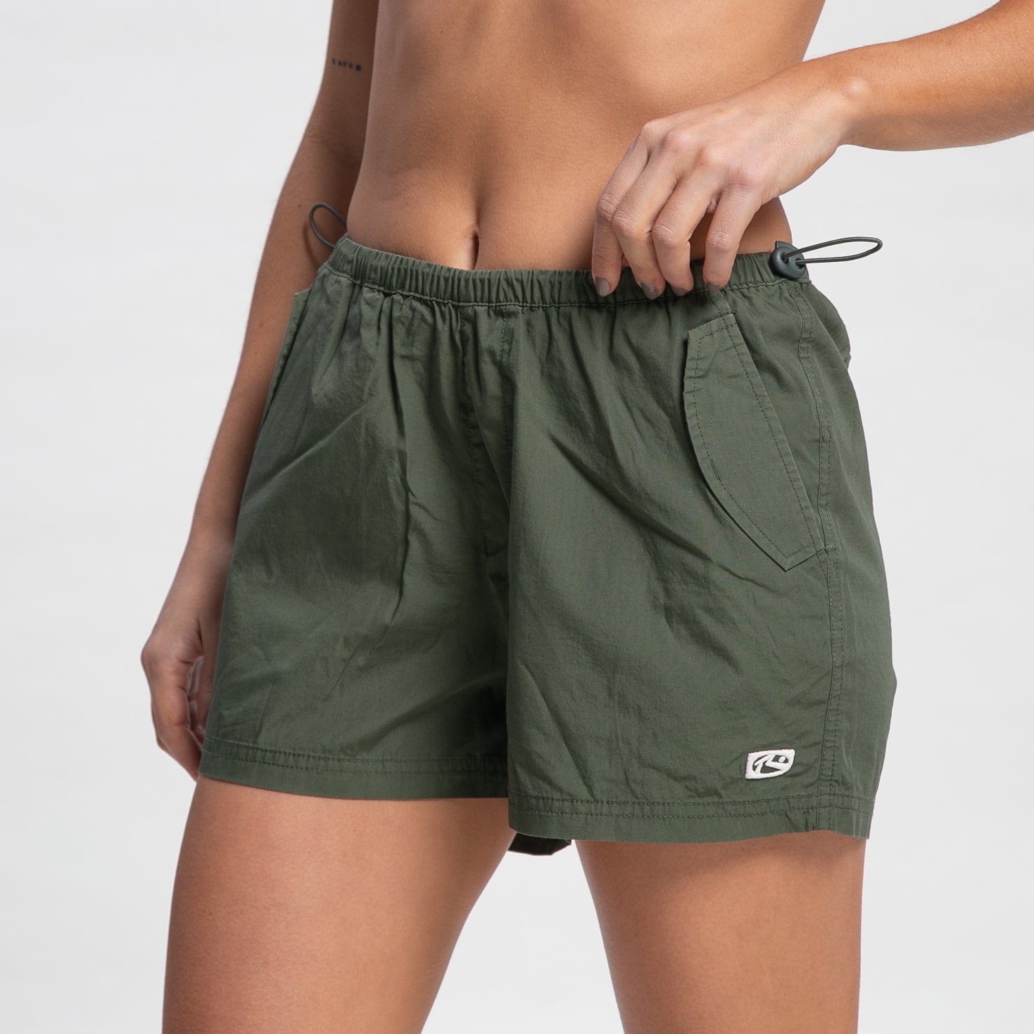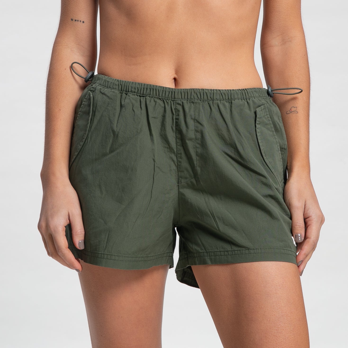Short relaxed fit con cintura elastizada, ajustable por medio de cordón elástico y tancas. Bolsillos frontales con tapa y bordado a contratono.
