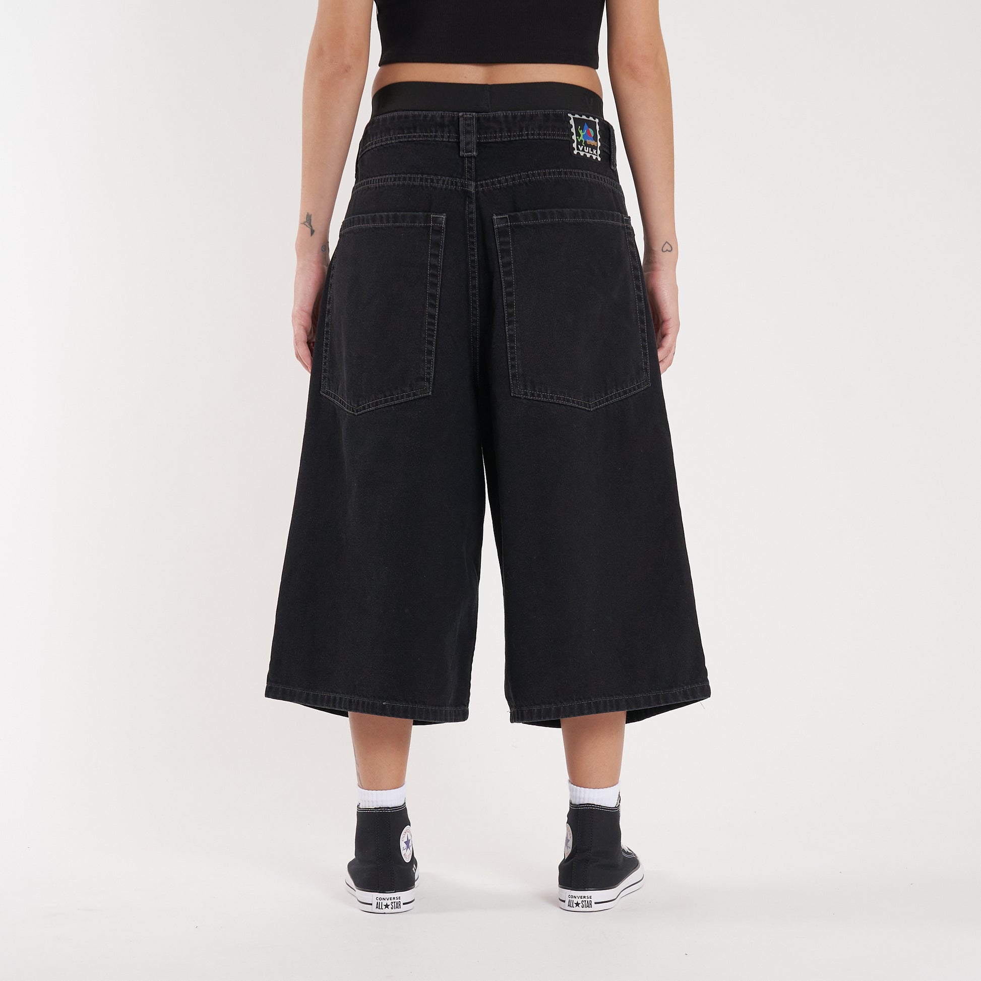 Detalles: Botones y remaches metálicos.Etiqueta de tejida multicolor en cintura y bordado en bolsillo delantero. Bolsillos extra grandes en espalda y cordón de algodón para ajuste interno en cintura. Lavado negro parejo con reservas en costuras