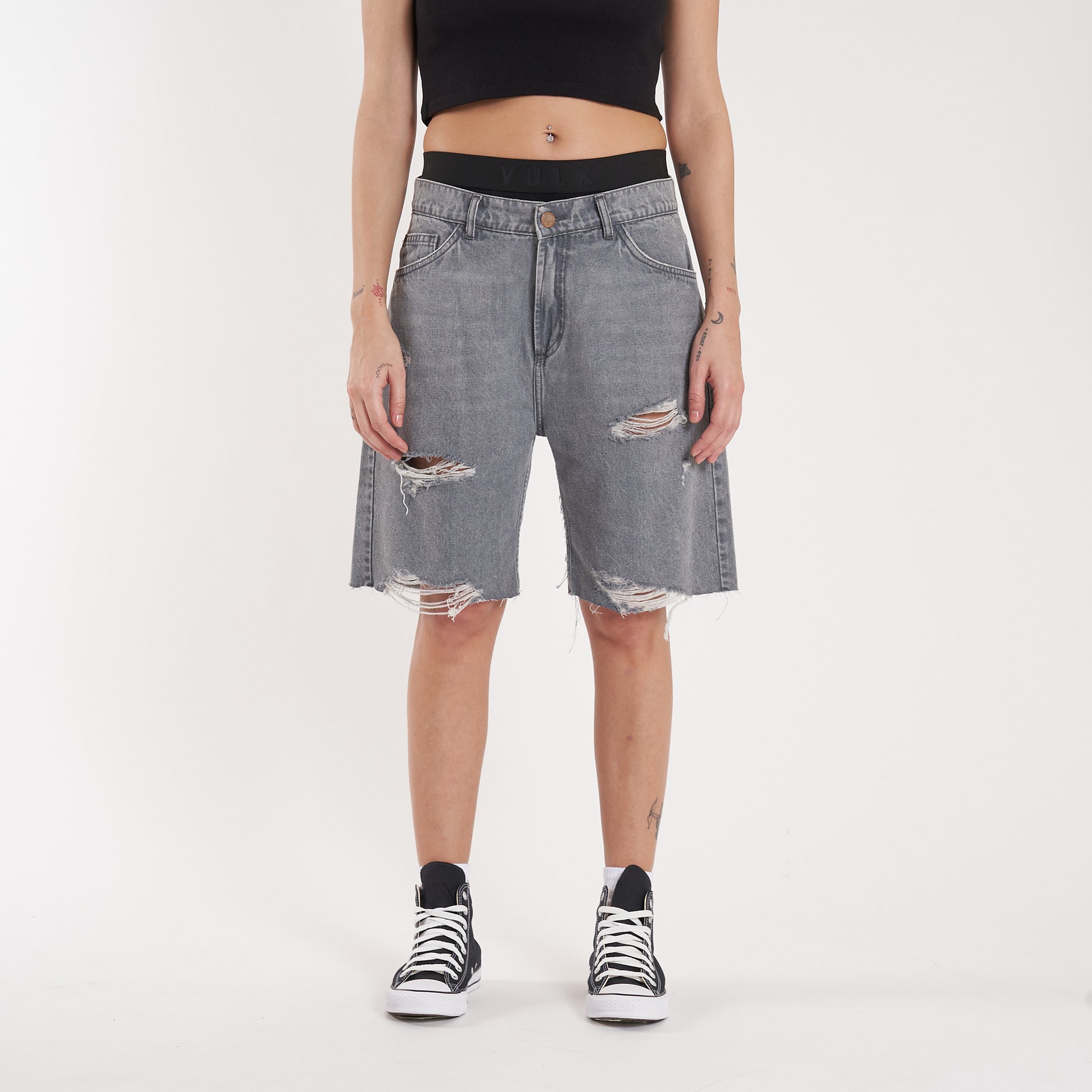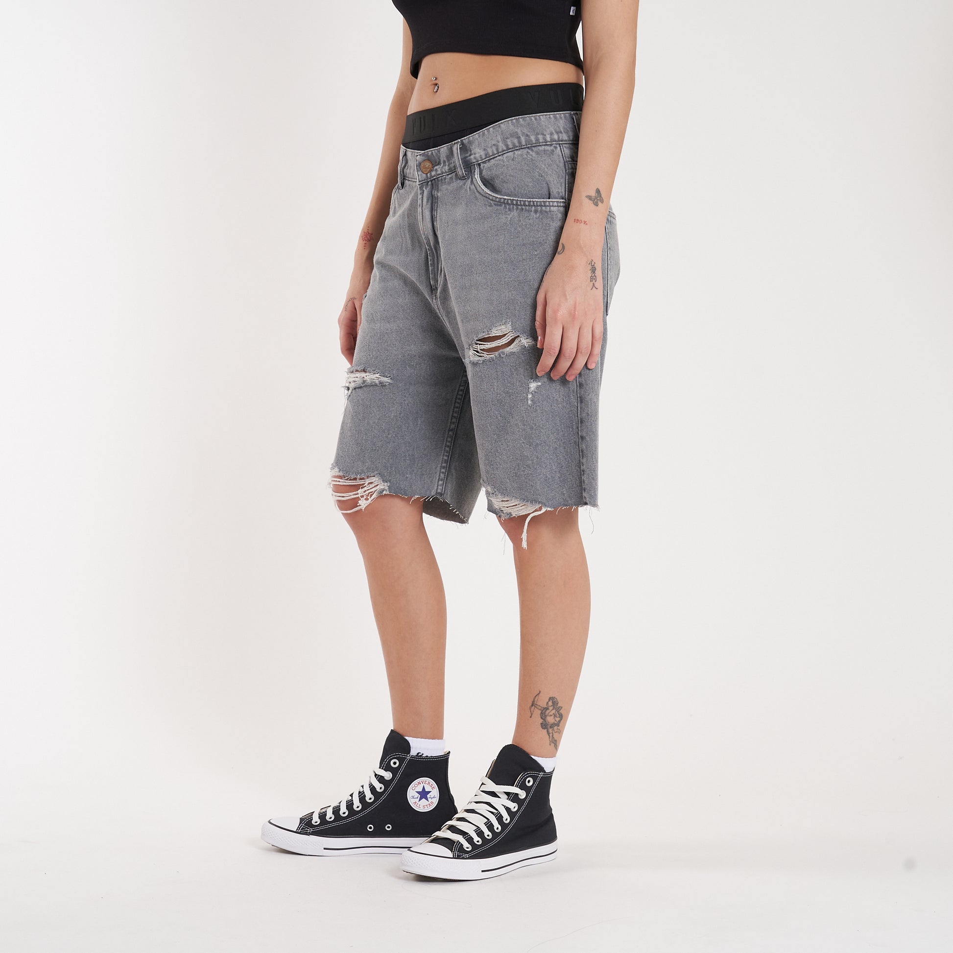Detalles: Botones y remaches metálicos.Etiqueta de ecocuero en cintura. Roturas en piernas y ruedo al corte. Lavado negro-gris acid wash