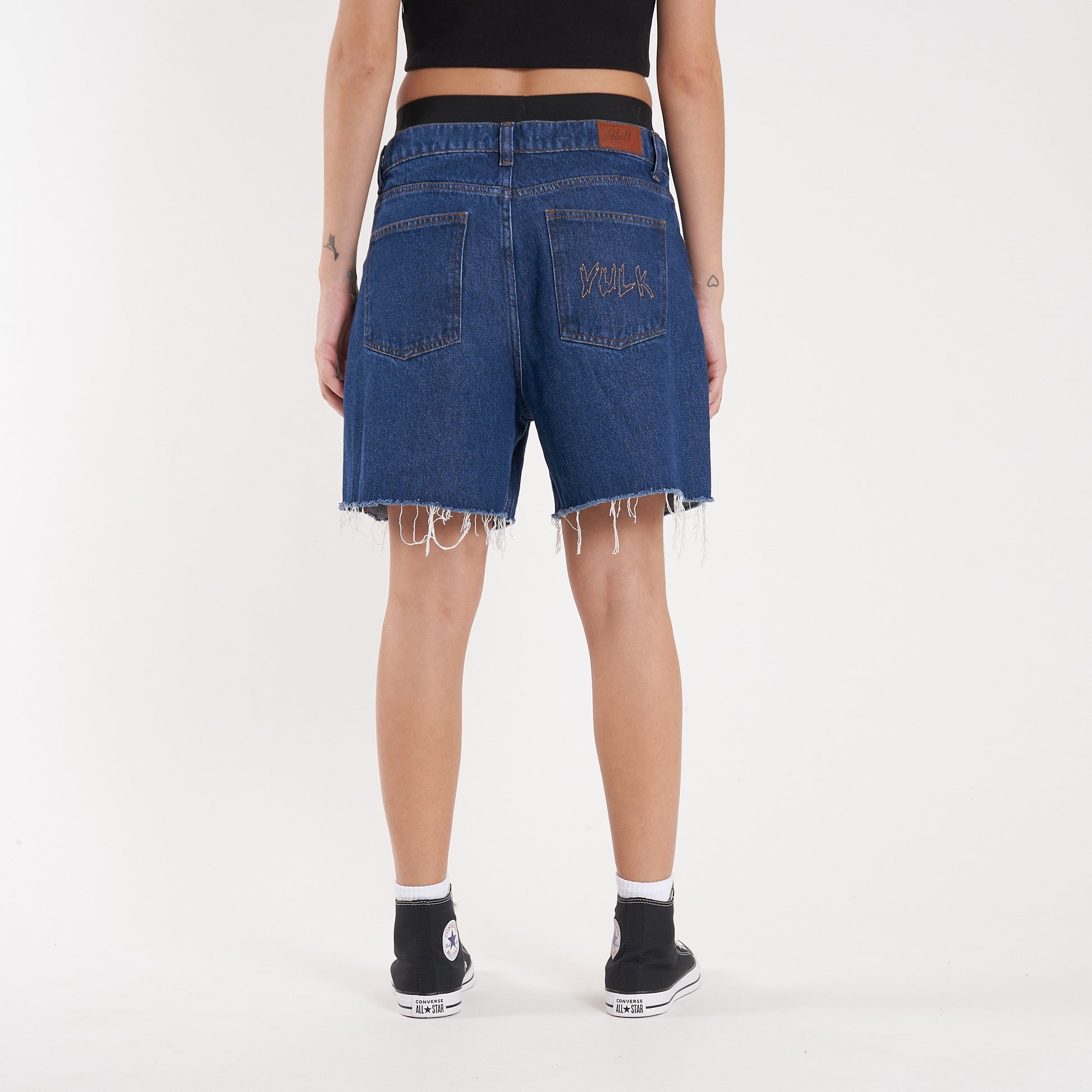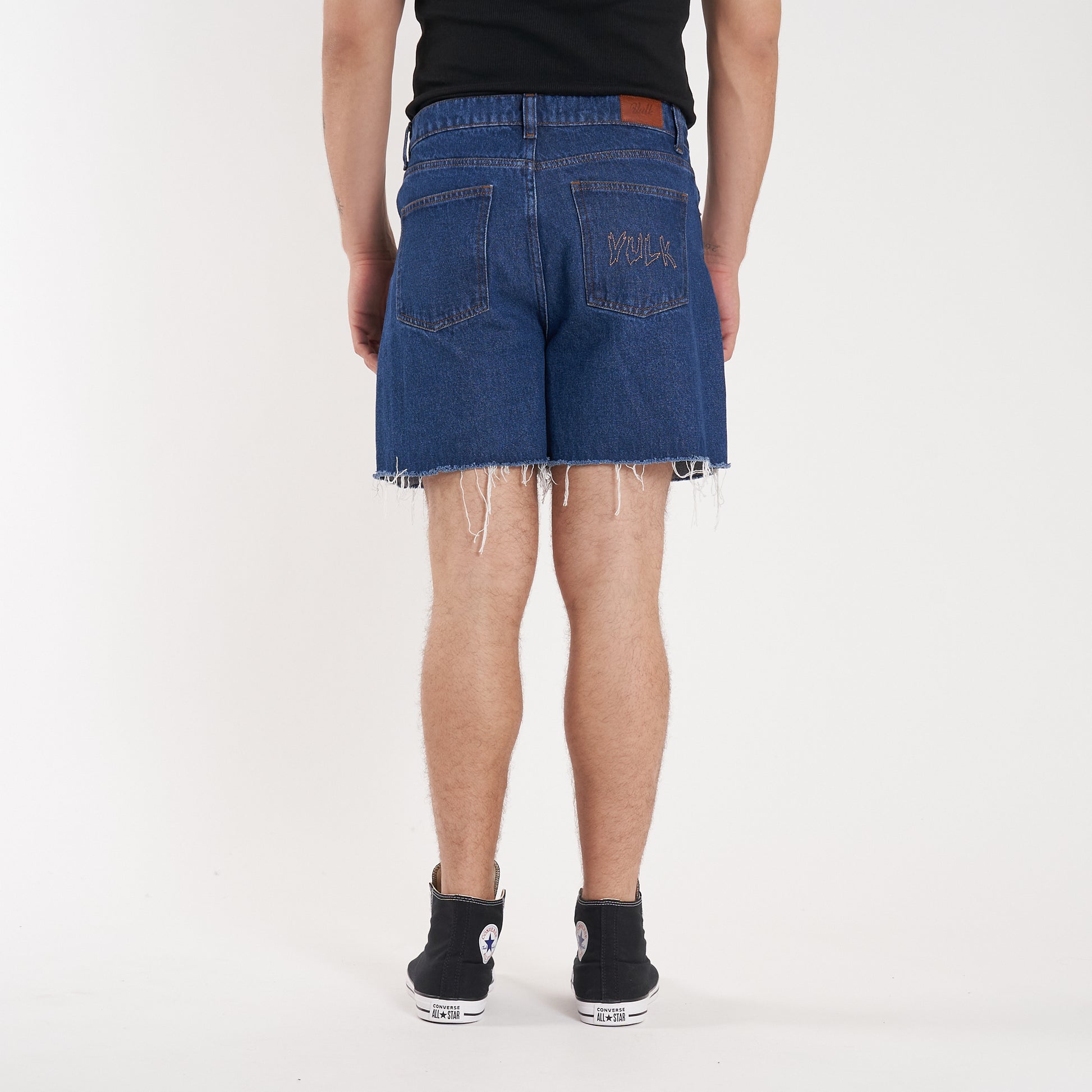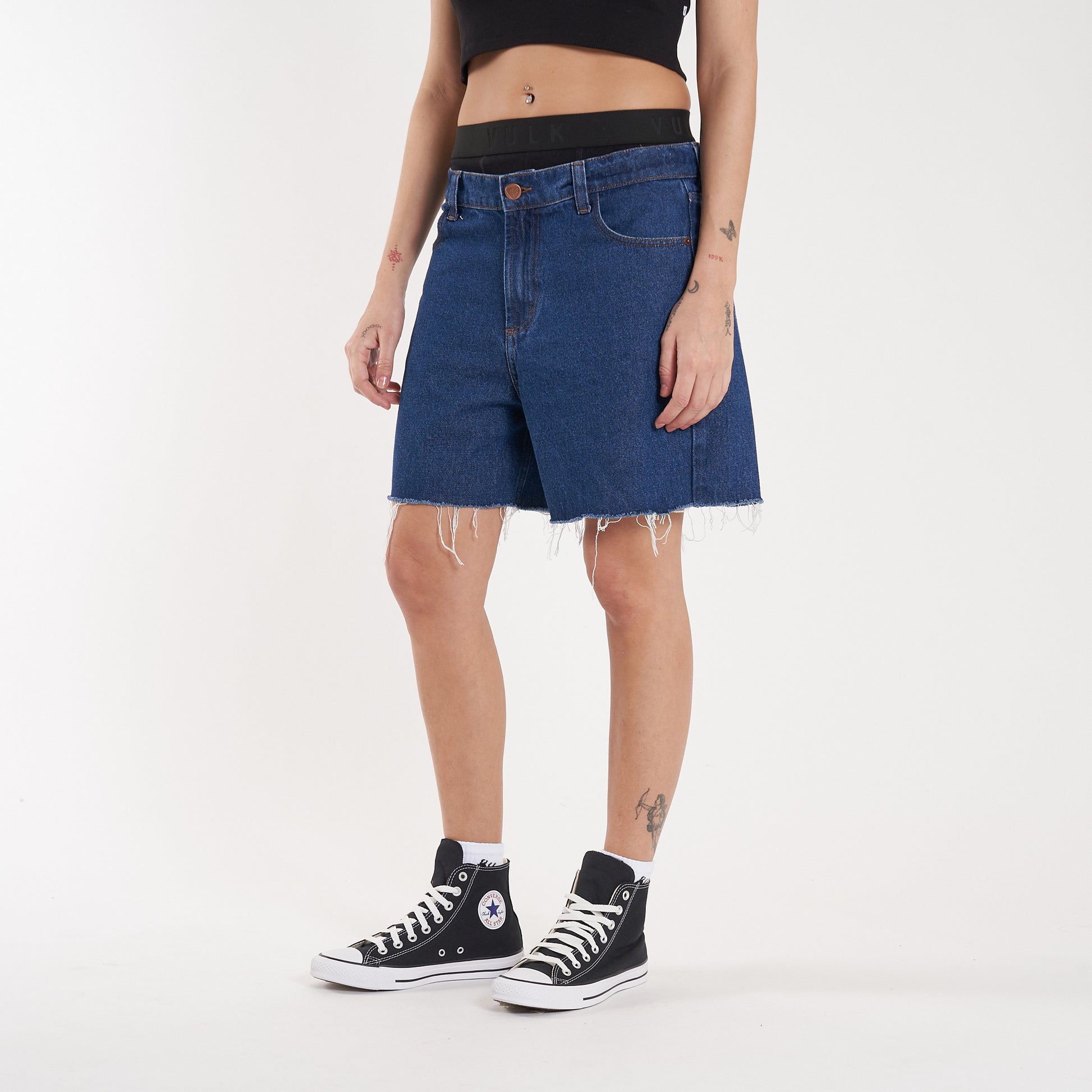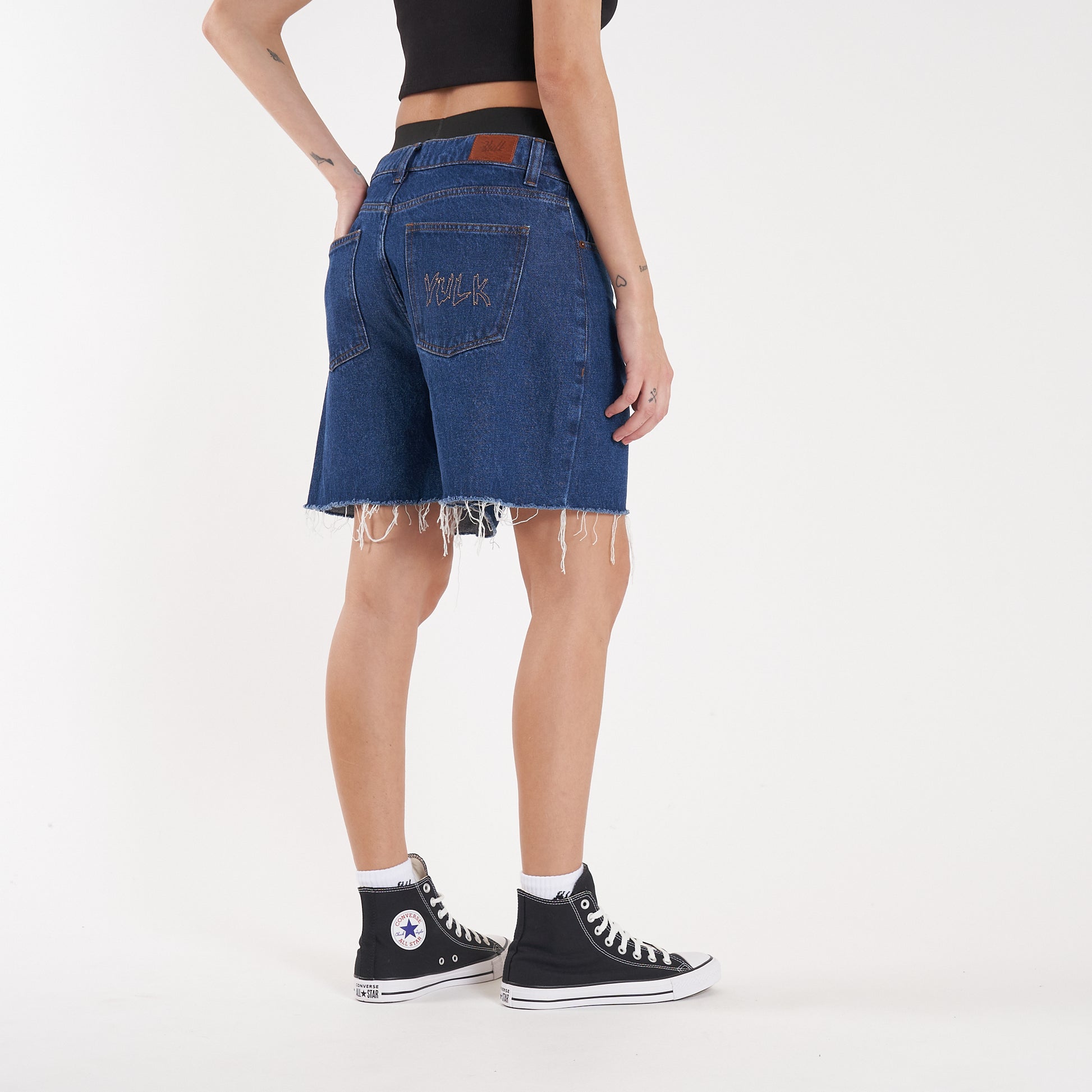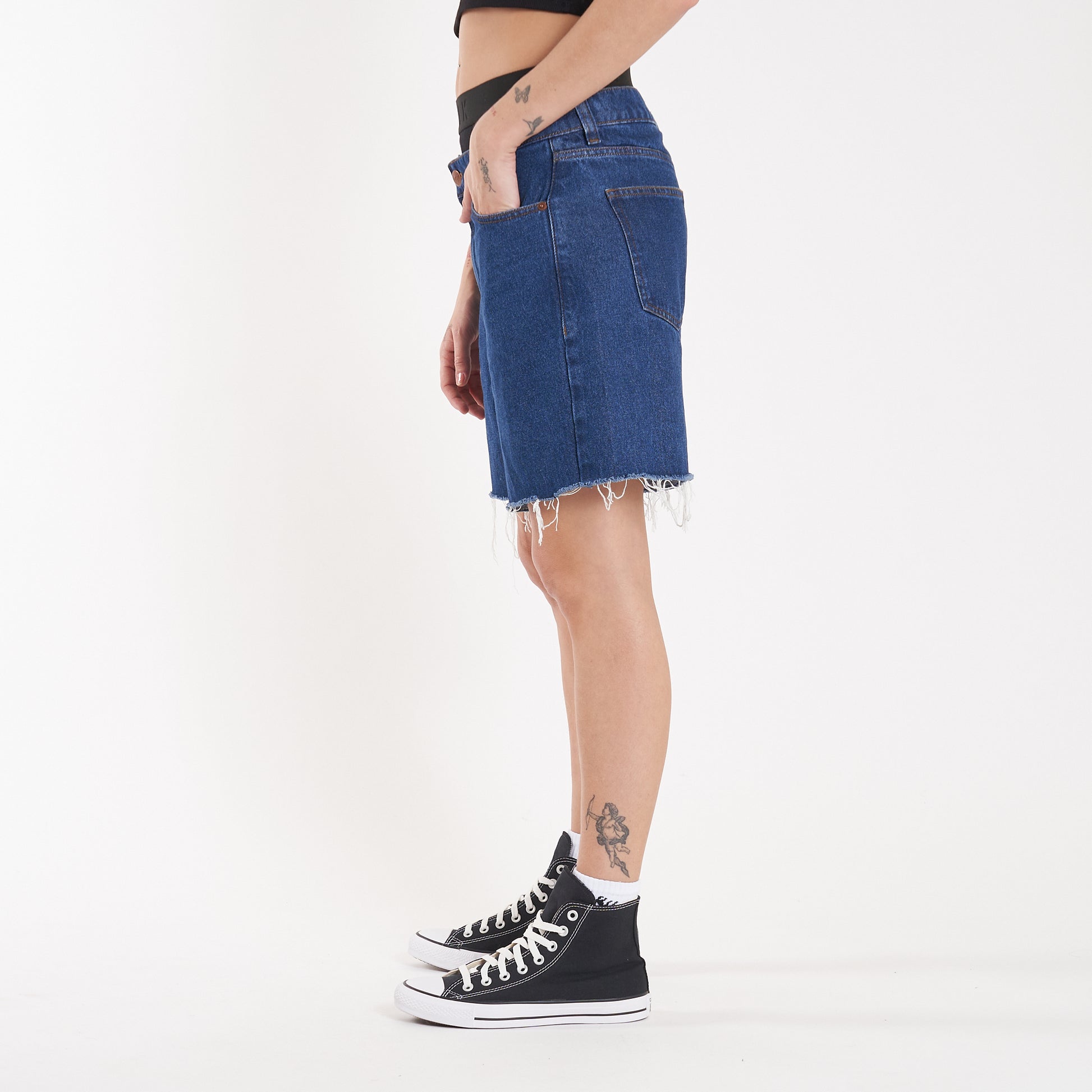 Detalles: Botones y remaches metálicos.Etiqueta de ecocuero en cintura. Lavado azul intenso parejo, con ruedo al corte y bordado en bolsillo trasero