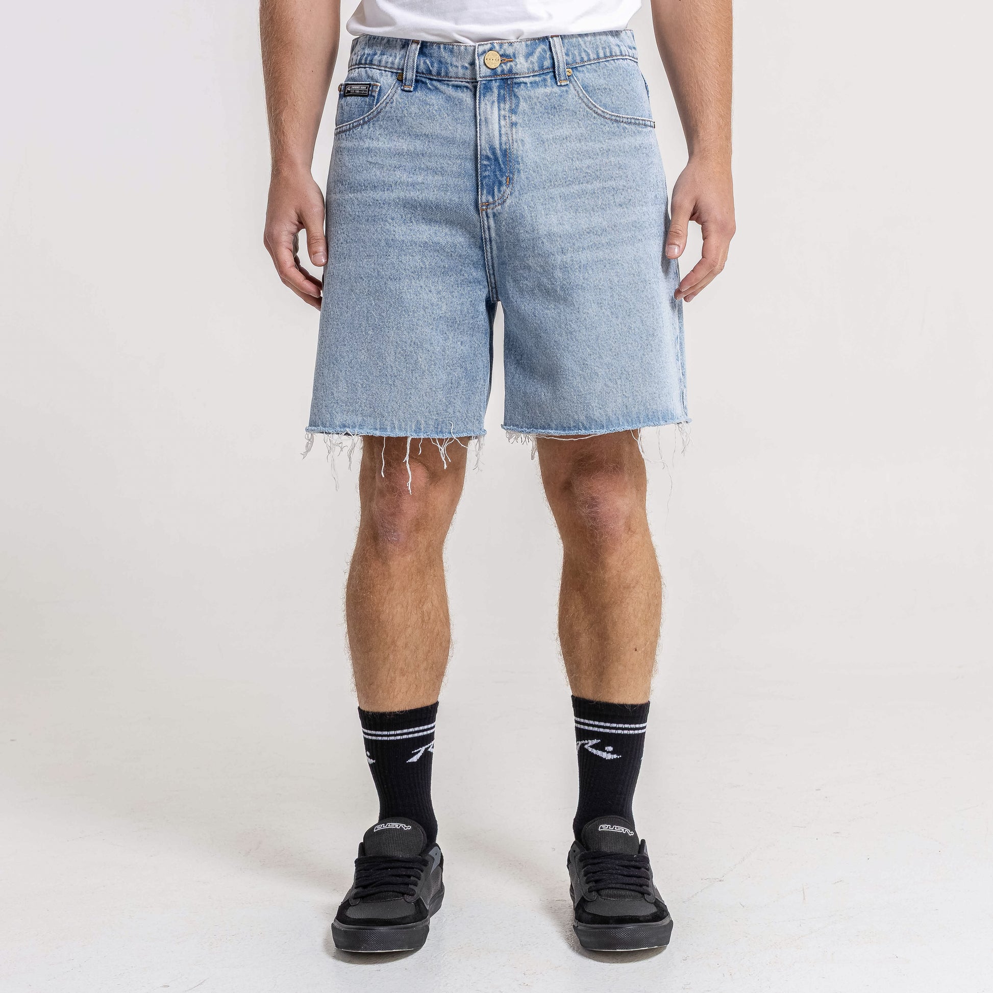 Detalles Clásico 5 bolsillos. Lavado intenso gastado con localizado. Botón y remaches cobre italiano. Bota al corte.