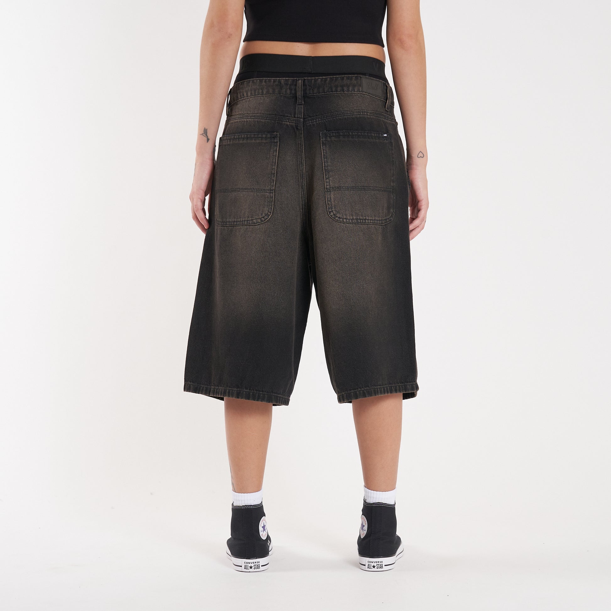 Detalles: Botones y remaches metálicos.Etiqueta de ecocuero en cintura. Lavado negro con desgastes oxidados