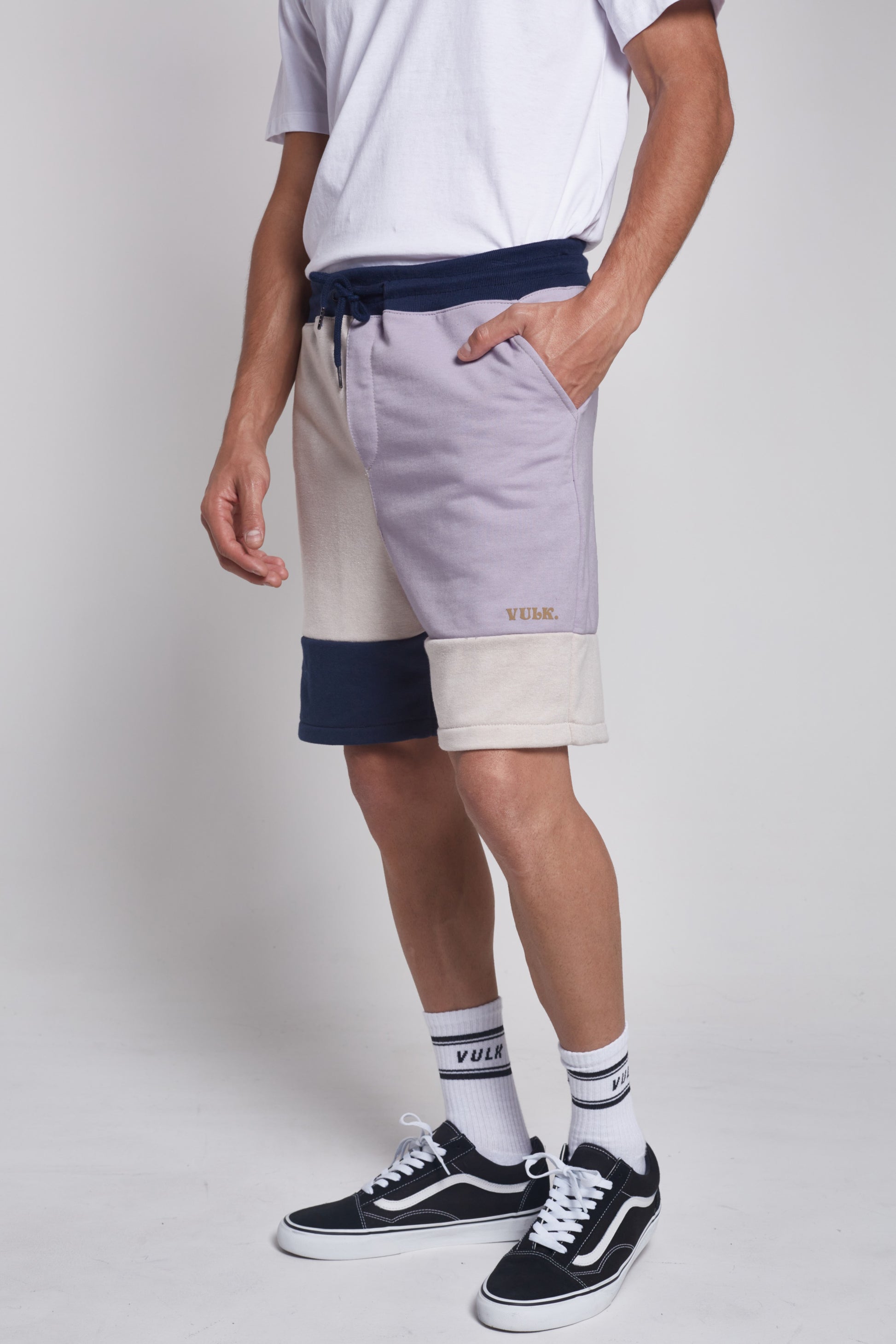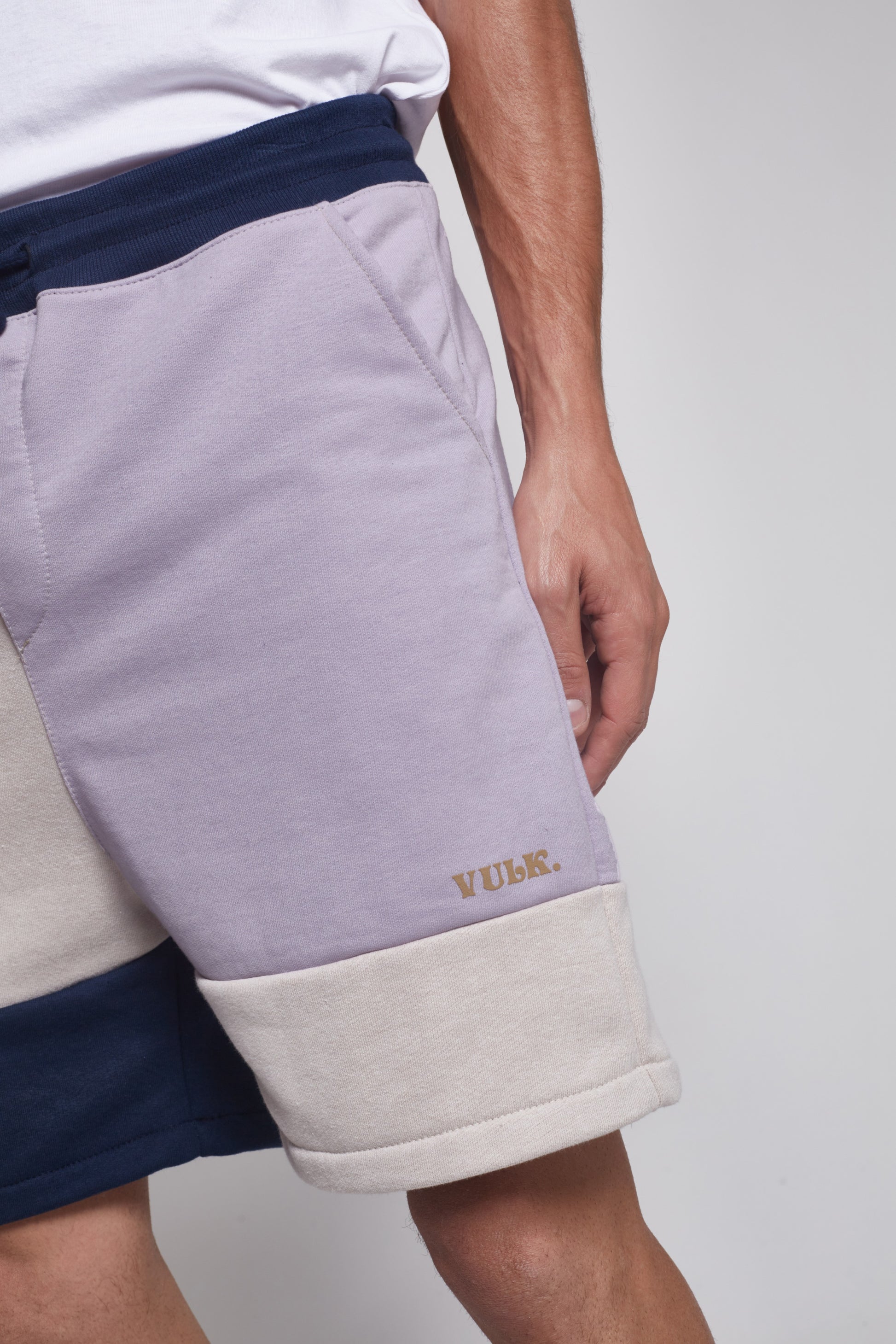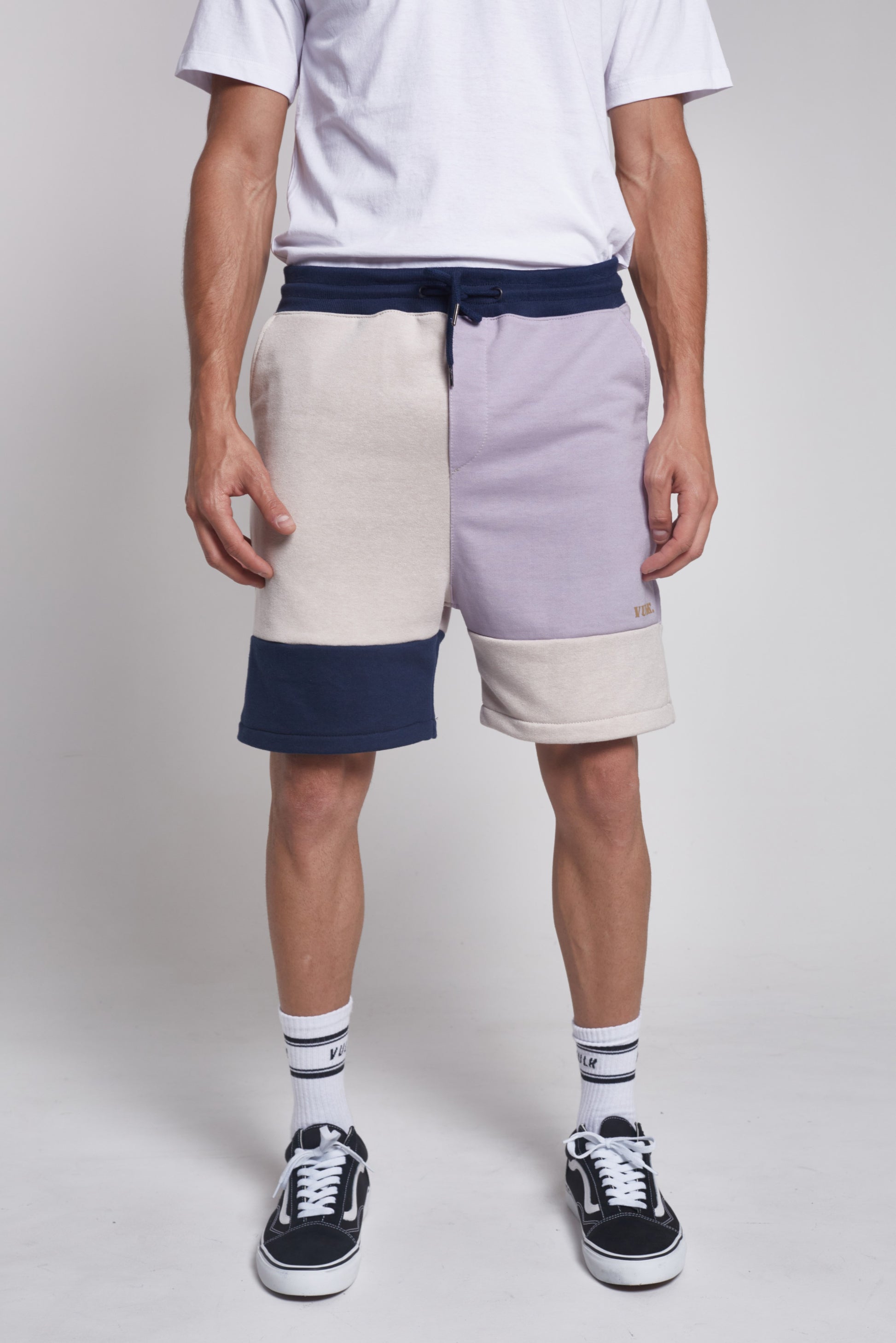 Short con recortes combinados d rustico algodón, con cintura elastizada y cordón.