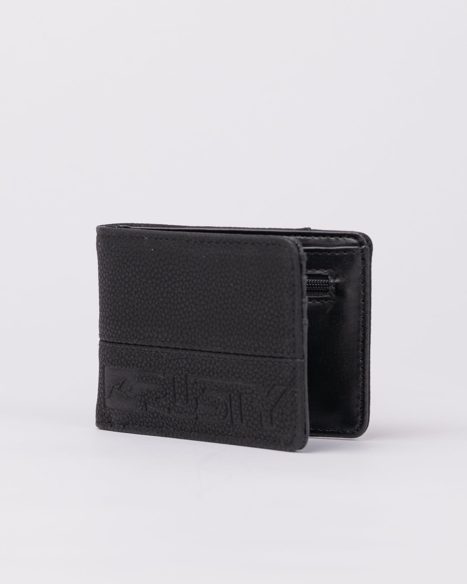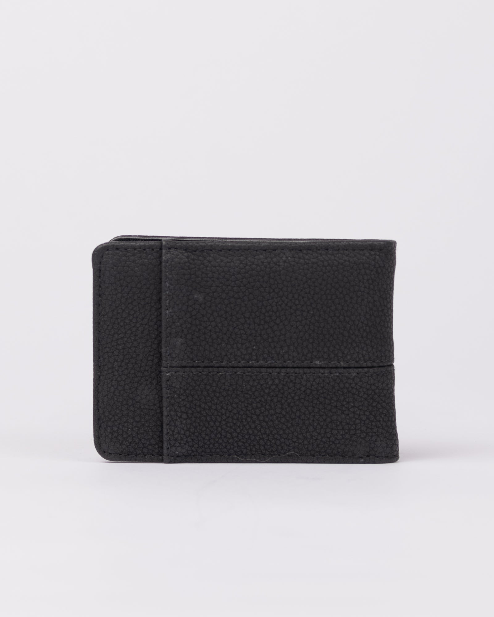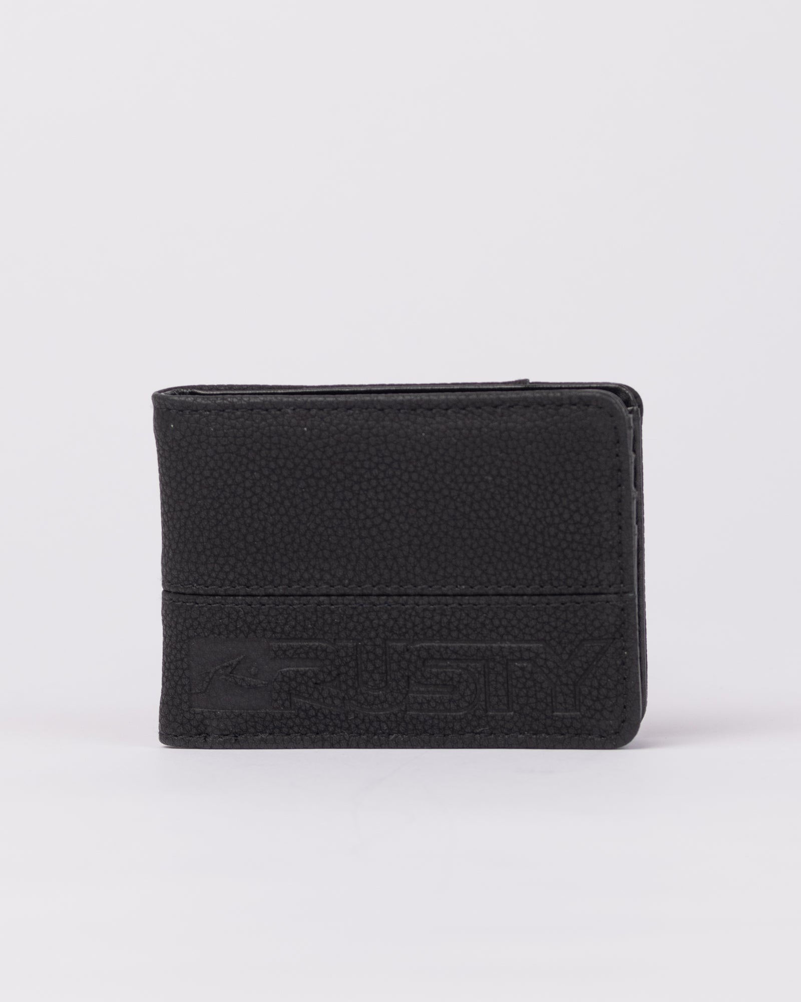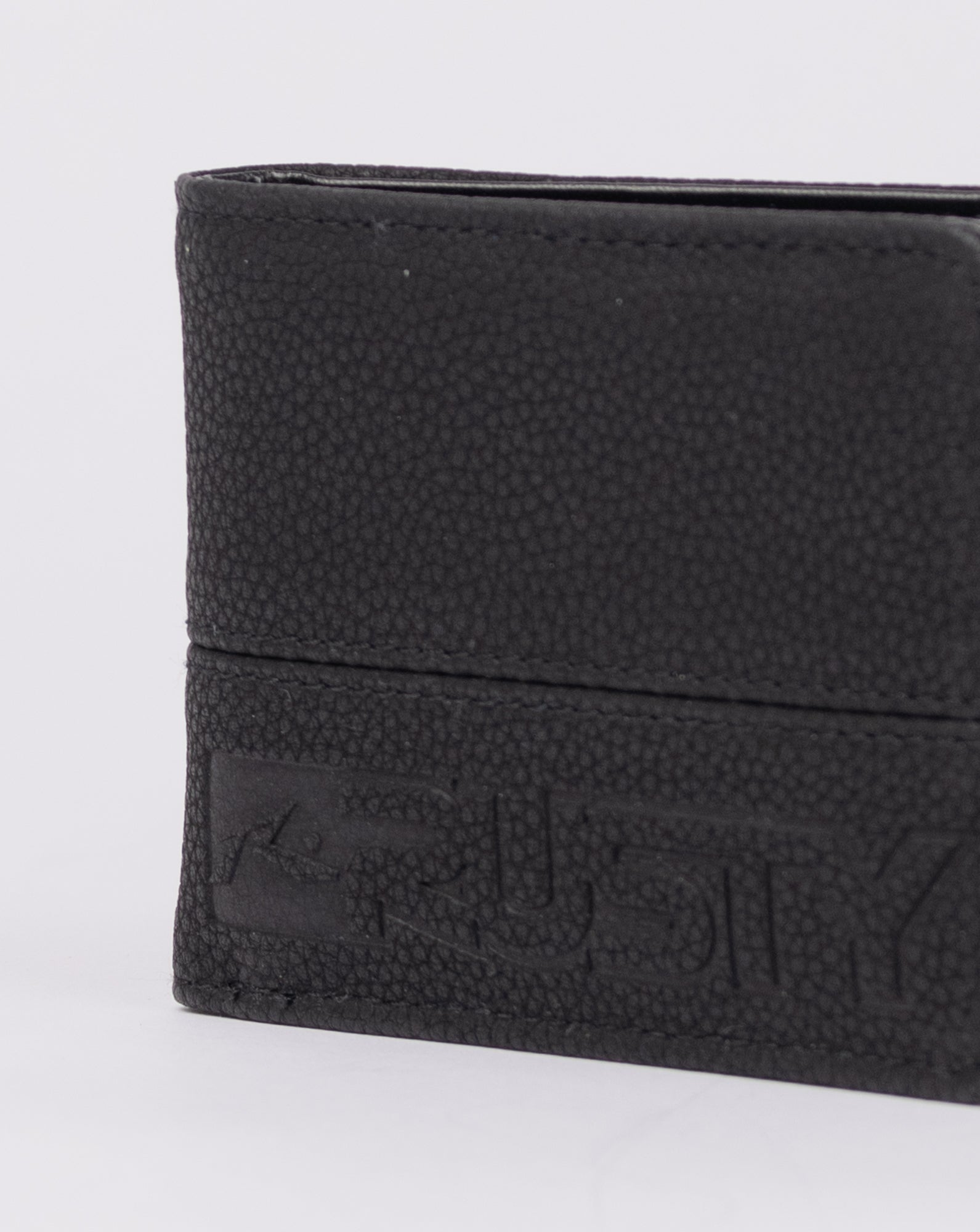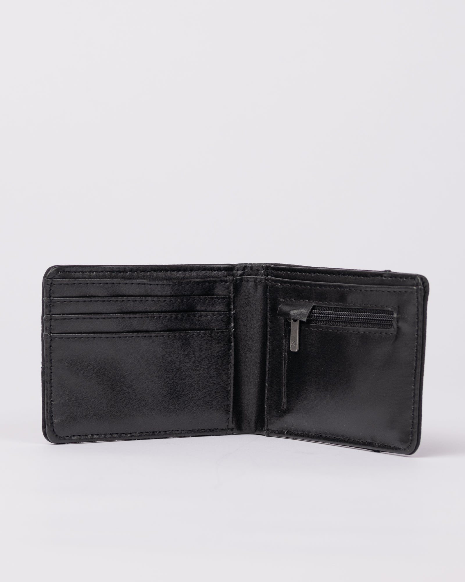 Detalles Billetera slim bifold con logo grabado en bajo relivee. Posee tarjetero y monedero.
