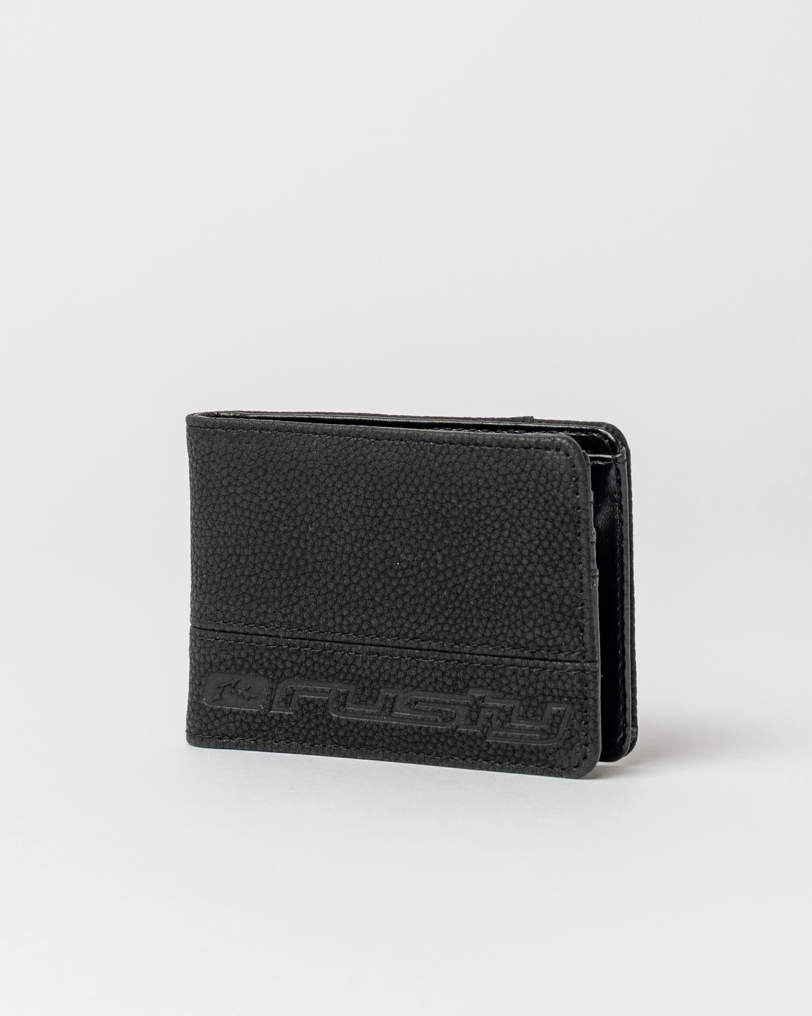 Una billetera fina de dos pliegues que resuelve todo sin abultar el bolsillo. El poliuretano le da un acabado liso y resistente al uso diario, con el logo Rusty en relieve al tono para mantener el perfil bajo. Tiene tarjeteros, compartimento para efectivo y bolsillo para monedas — organización completa en un formato compacto. En negro, combina con todo y no desentona ni en una salida nocturna ni en el día a día más relajado. La sacás, pagás y listo.
