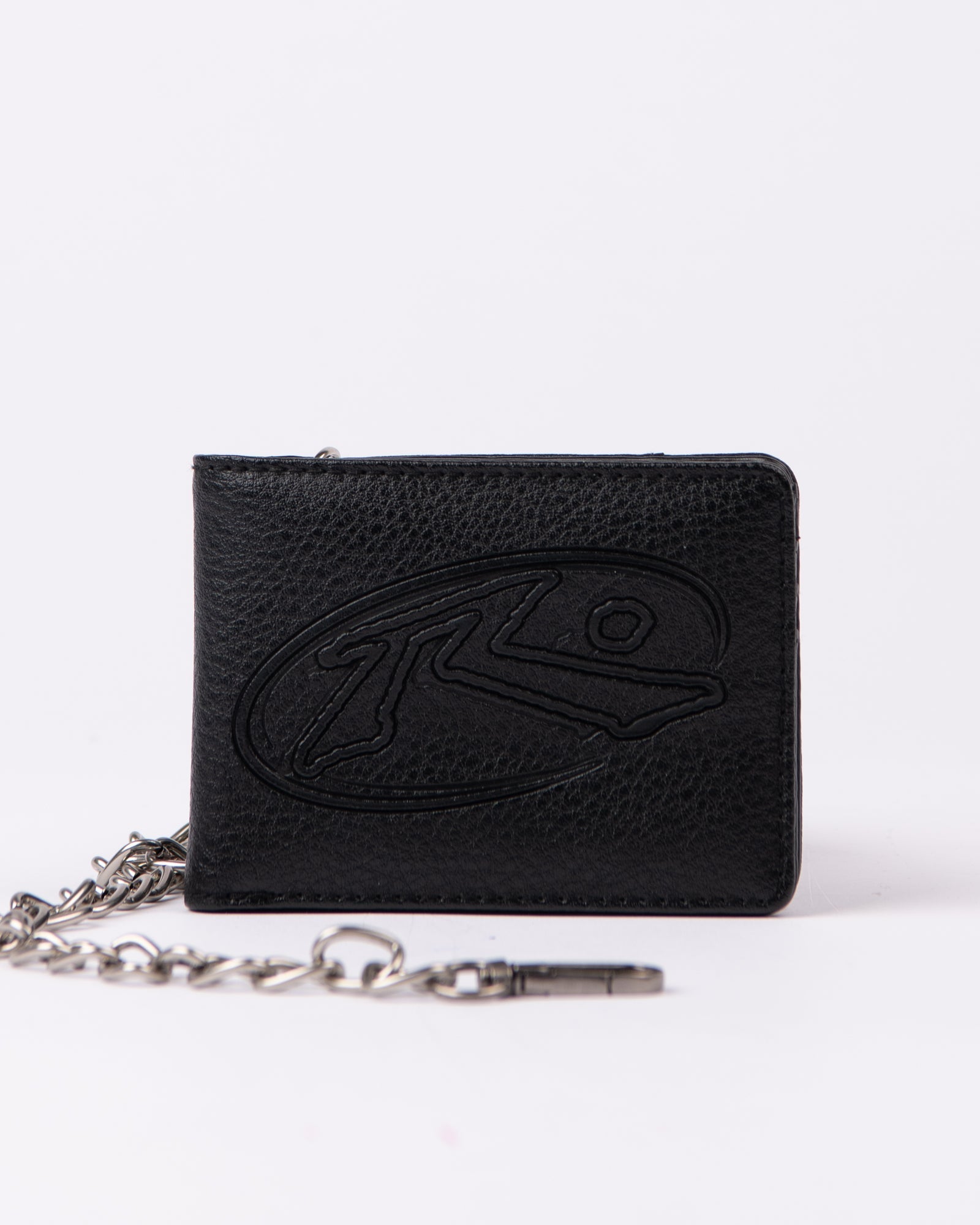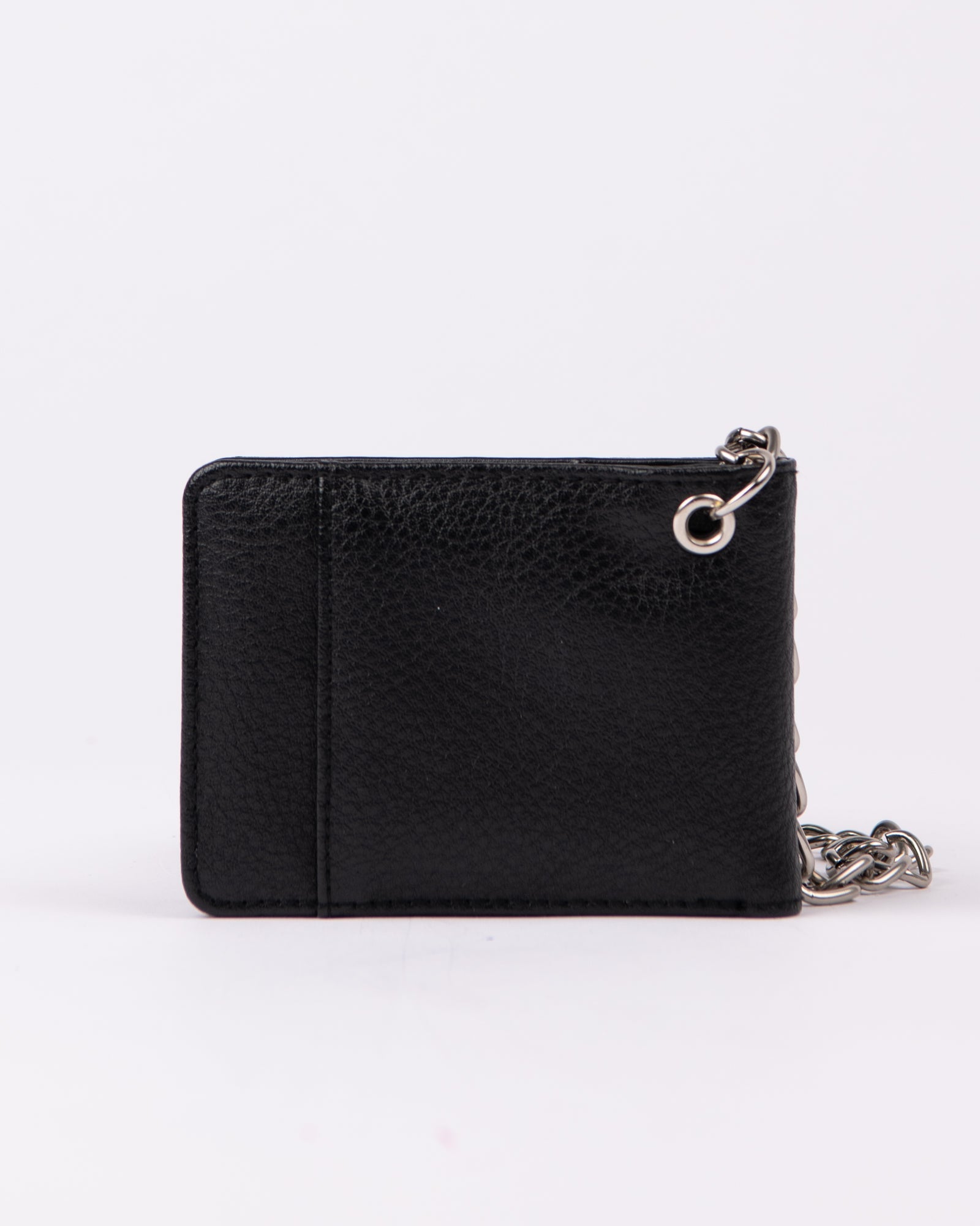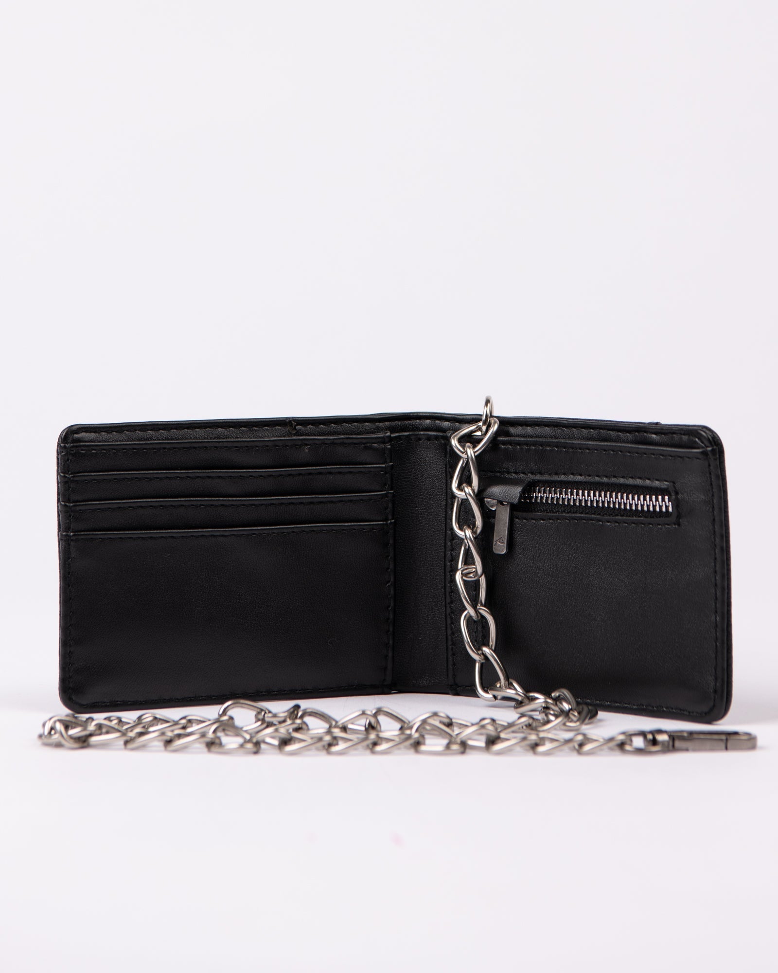 Billetera bifold con logo grabado. Posee tarjetero, monedero y cadena de seguridad para enganchar a la presilla del pantalón.