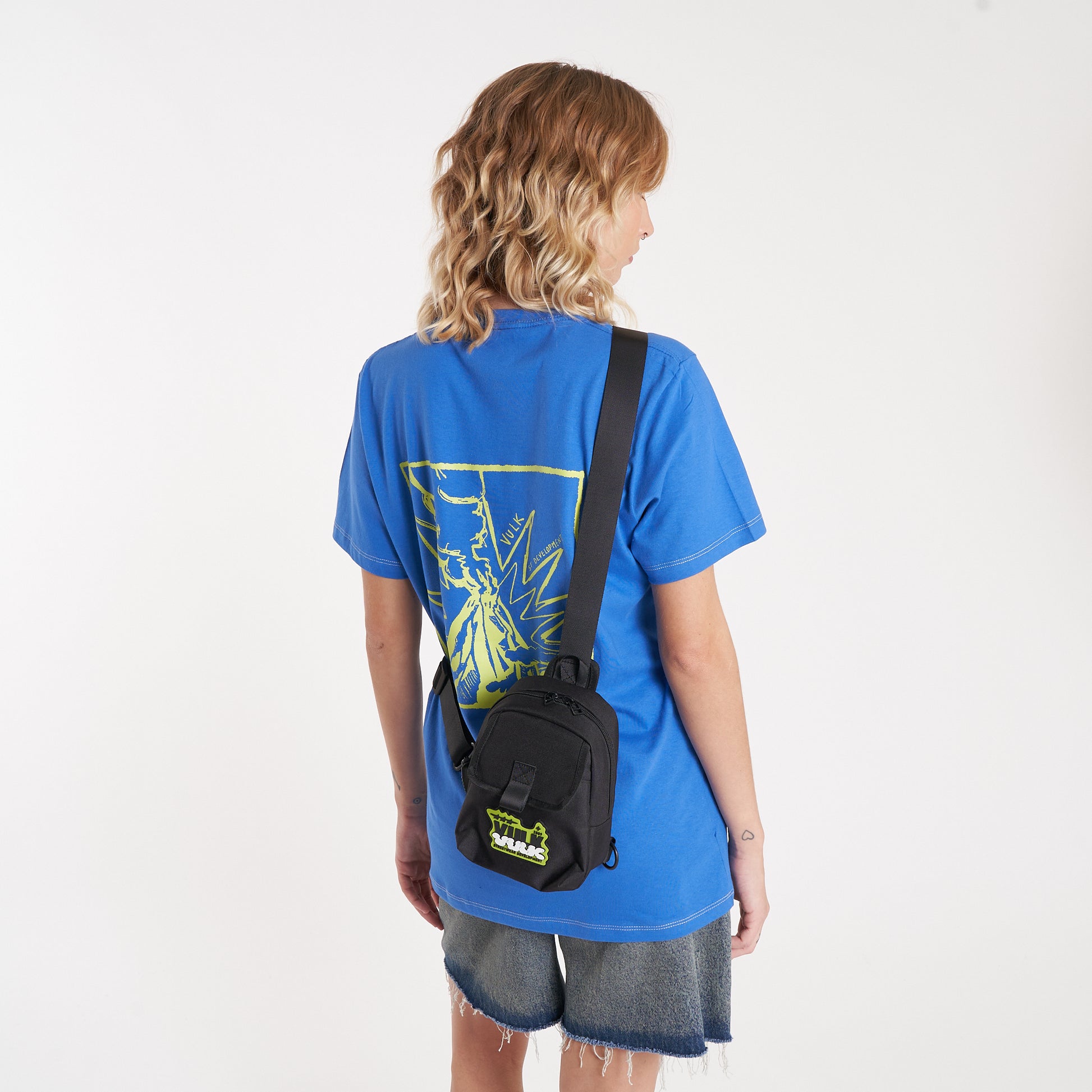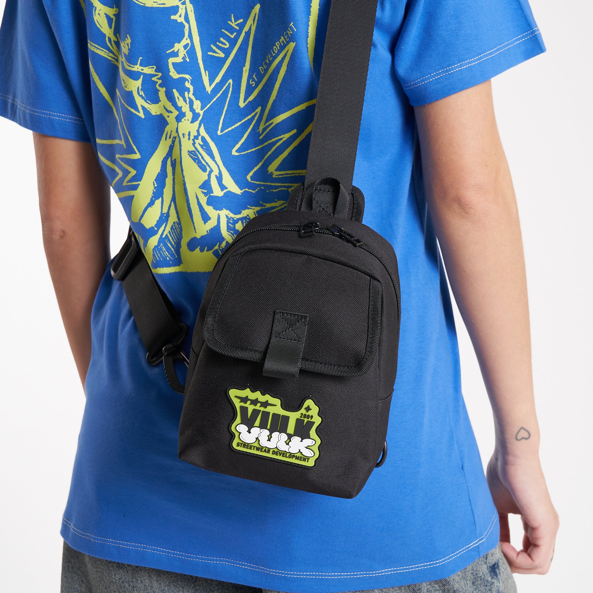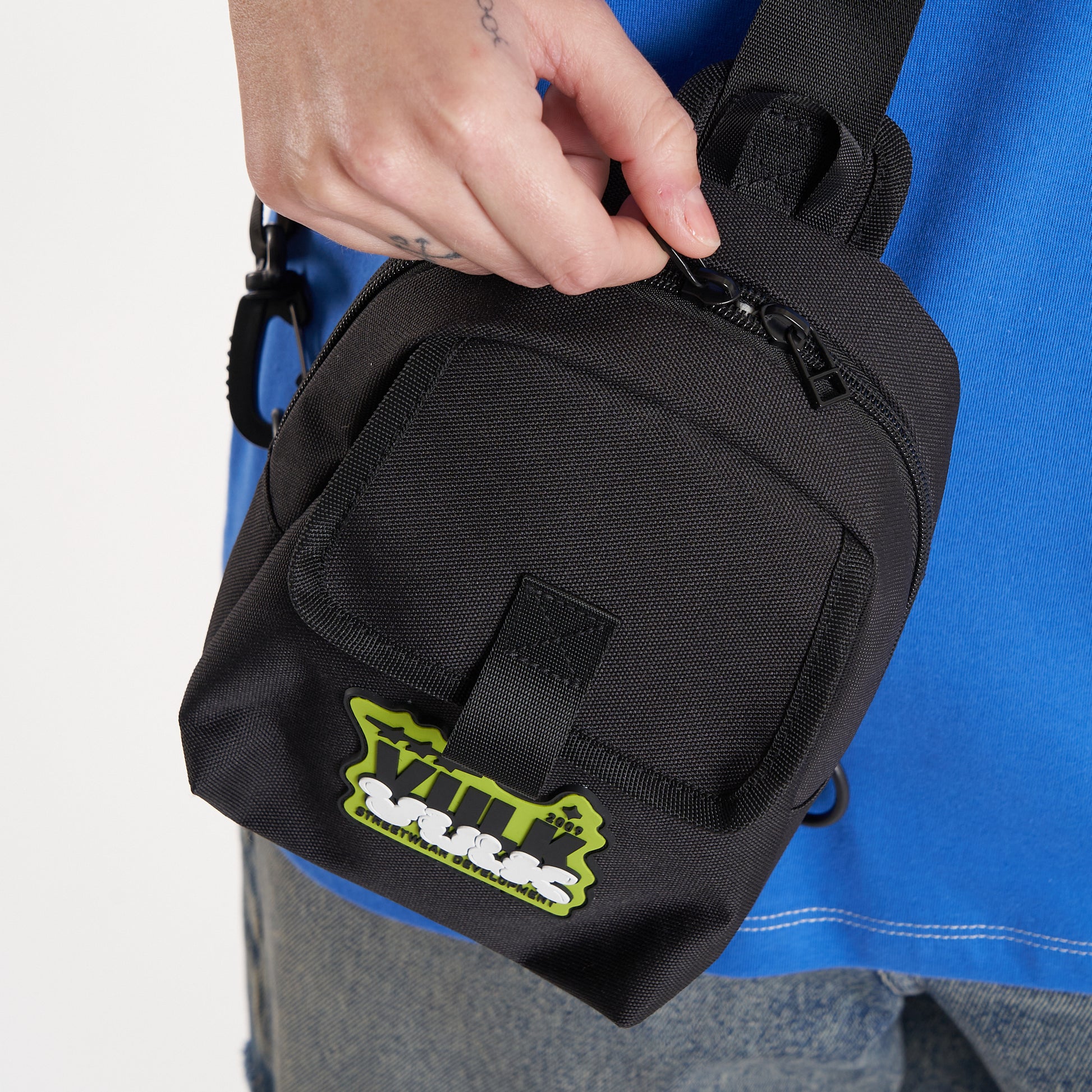 Detalles: Bolso pequeño con etiqueta engomada con relieve en frente. Bolsillo con cierres y solapa con abrojo Tira regulable ajustable. Gancho metálico para múltiples formas de uso
