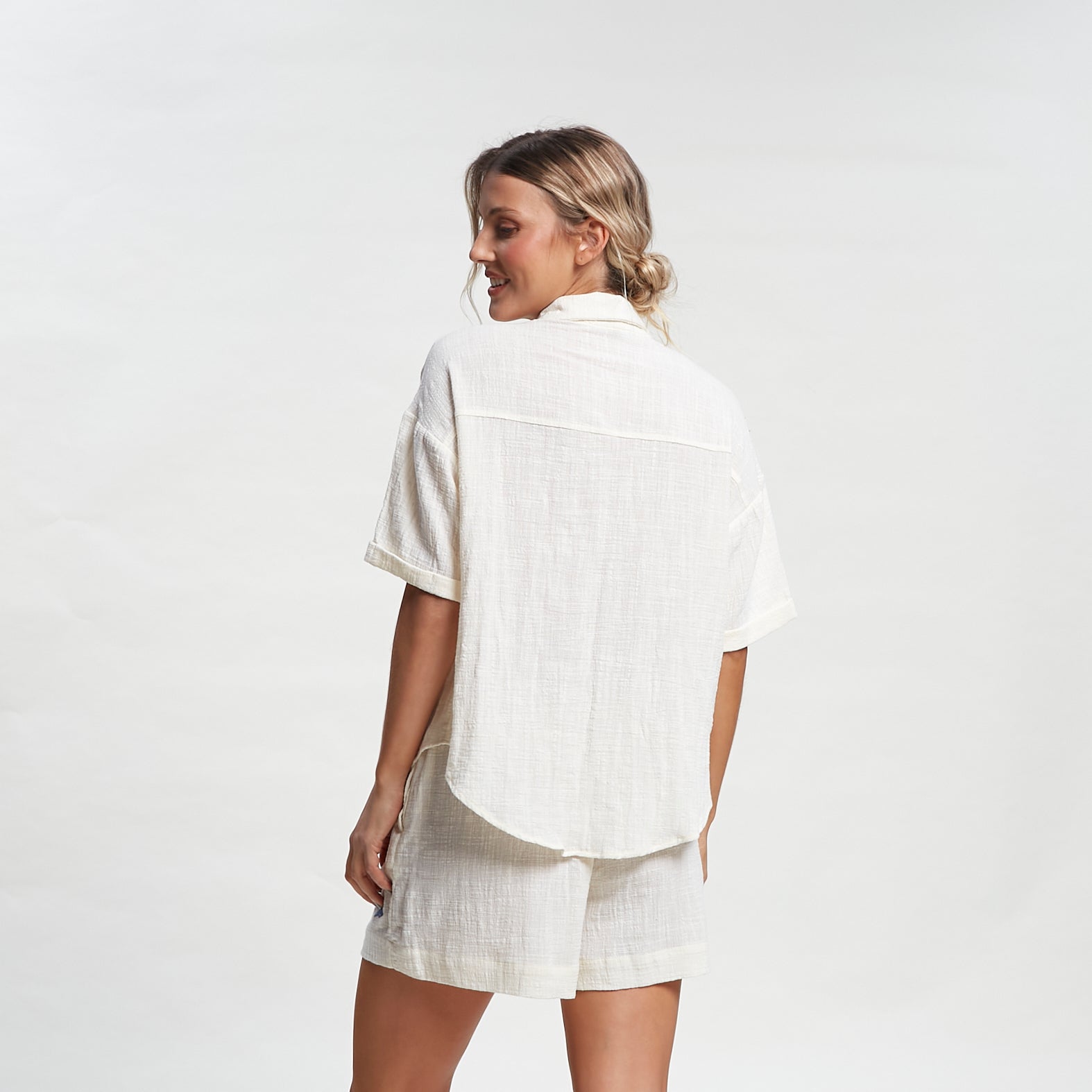 Camisa manga corta con hombros caídos, botones en la parte delantera y en el cuello. Oversized fit. Bordado logo delantero a dos colores.