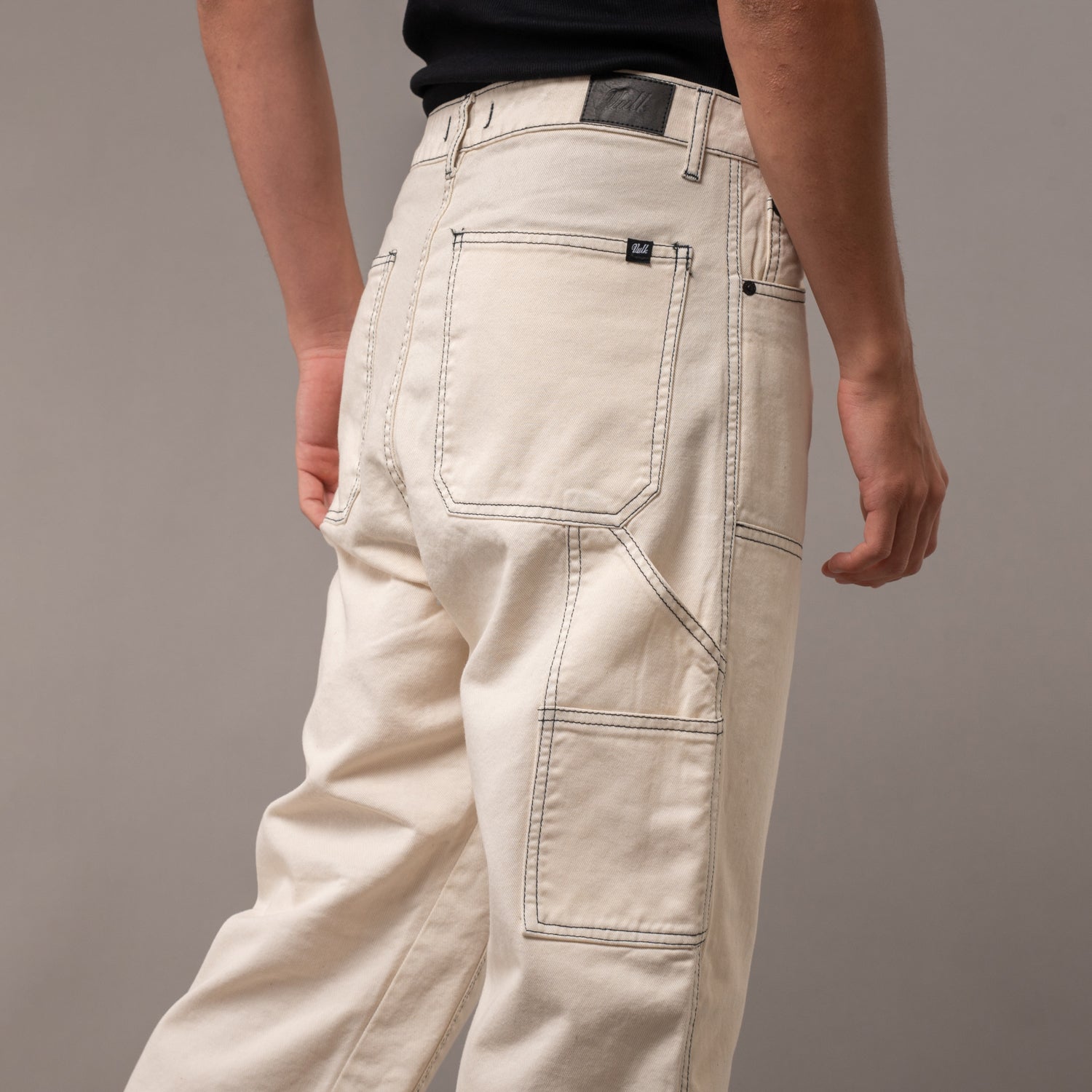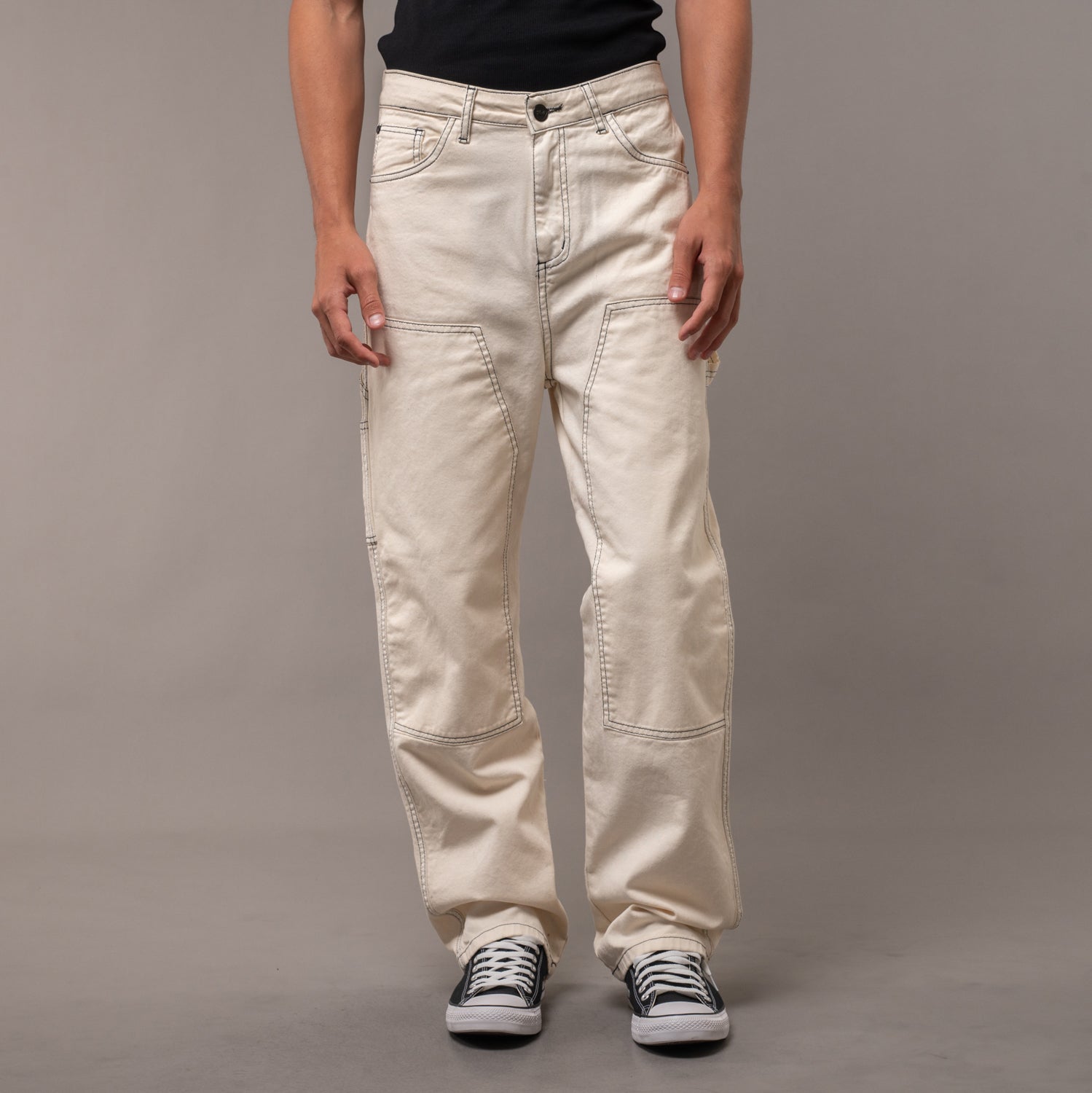 Detalles: Jean carpintero relajado 5 bolsillos, tejido rígido. Recortes en pierna aplicados. Botones y remaches metálicos. Lavado suavizado manteniendo el color pleno, costuras a contratono