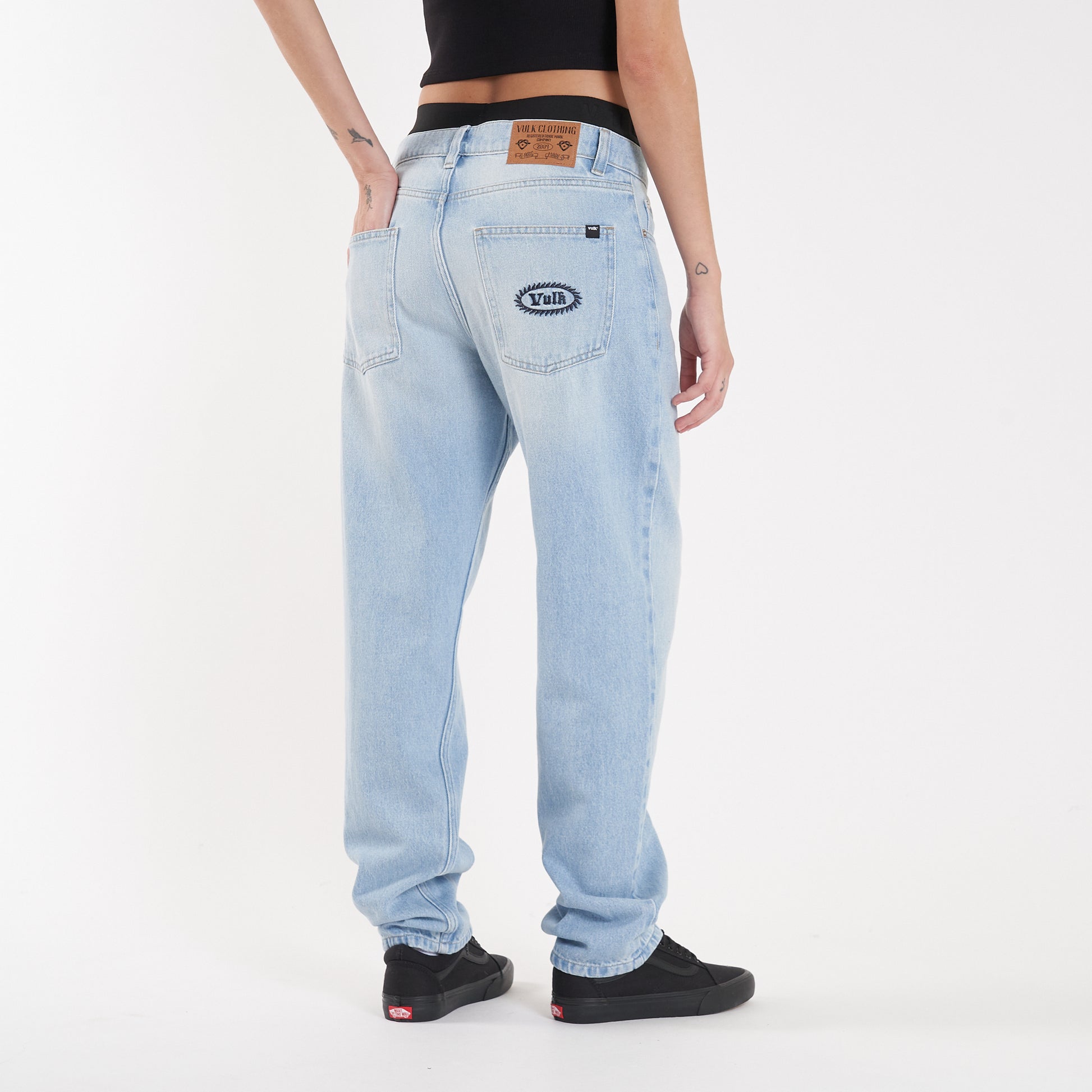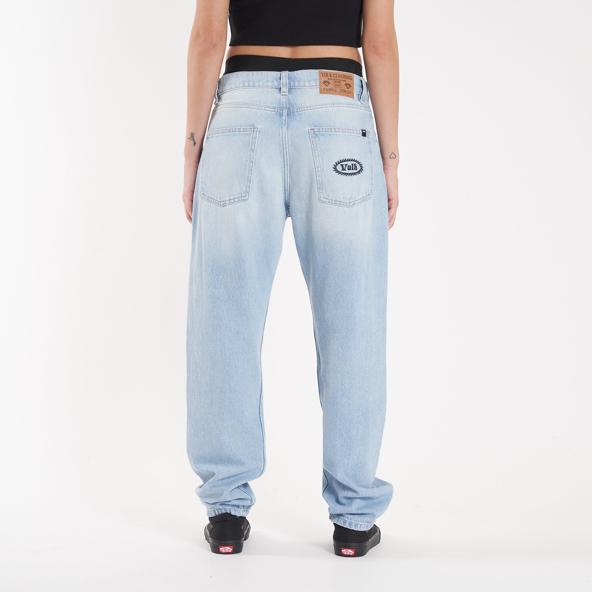 Detalles: Botones y remaches metálicos.Etiqueta de jacron en cintura. Bordado en bolsillo trasero, Lavado celeste con desgastes y reservas en uniones
