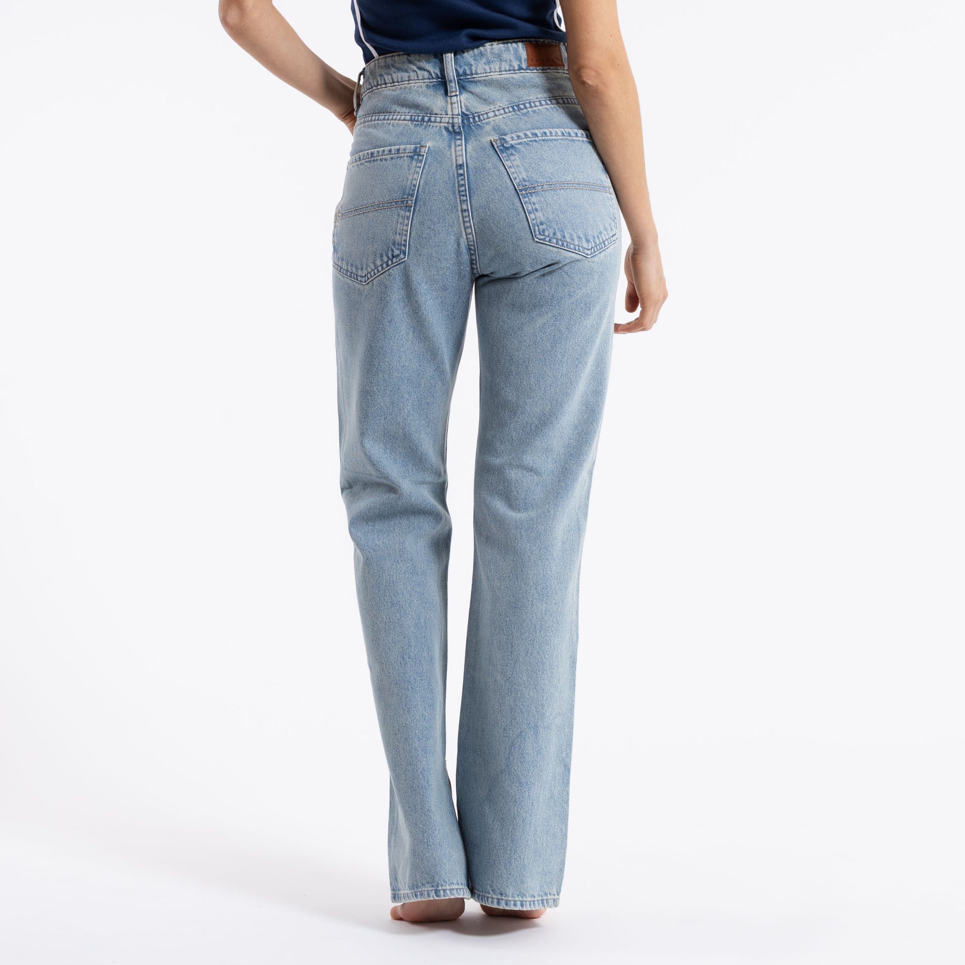 Detalles: Jean tiro alto, pierna corte bootcut, con tajos laterales. Lavado medio con bigotes y localizado matizado.