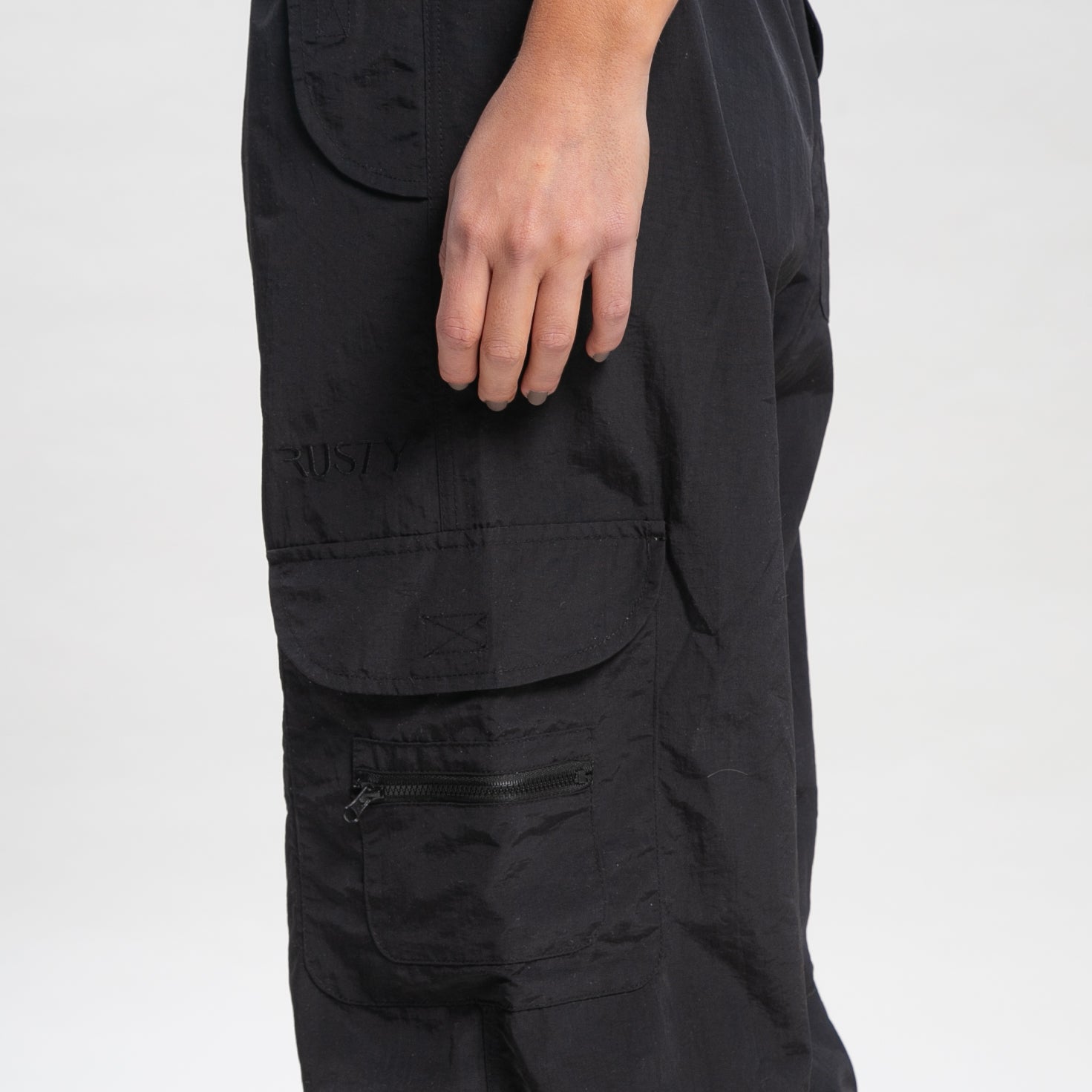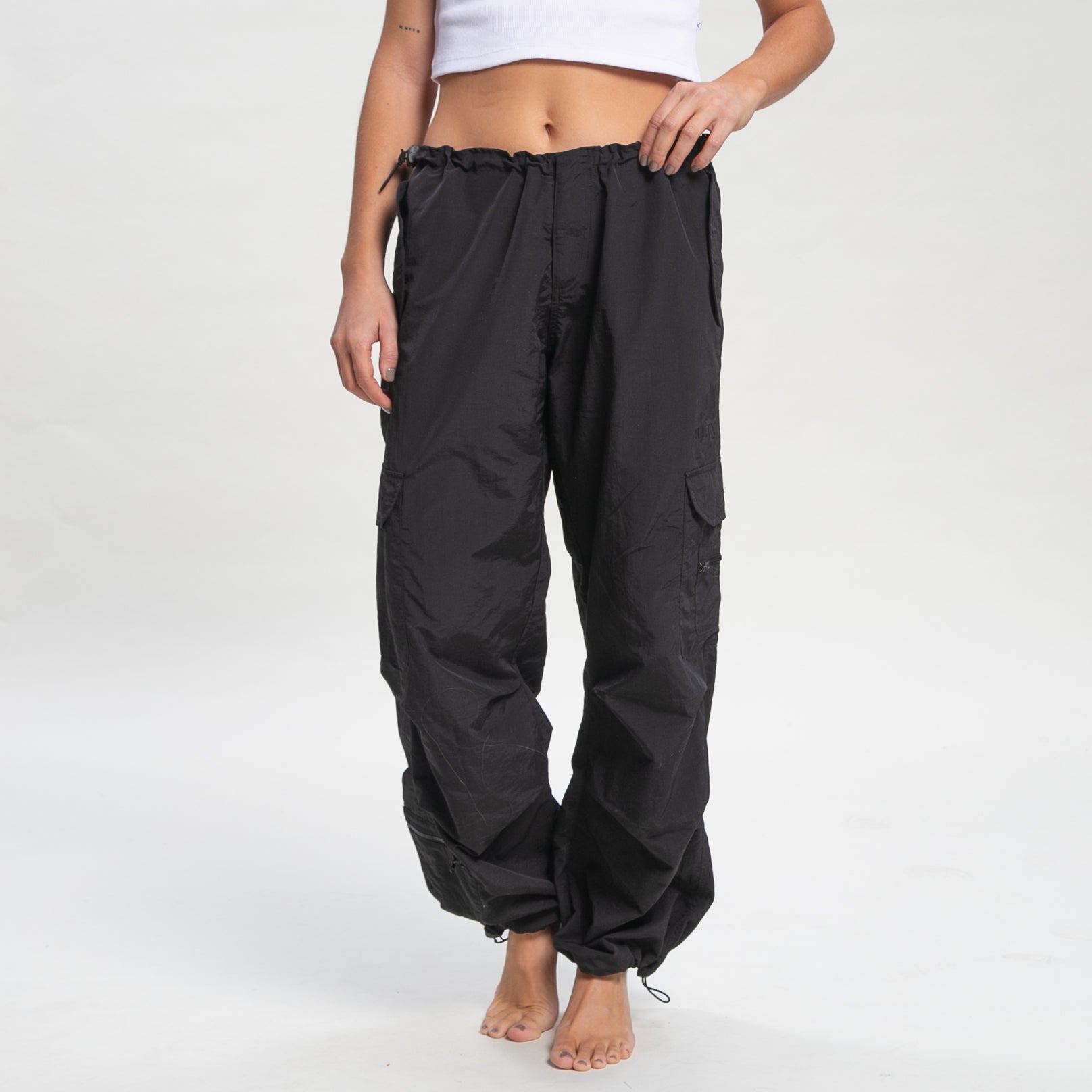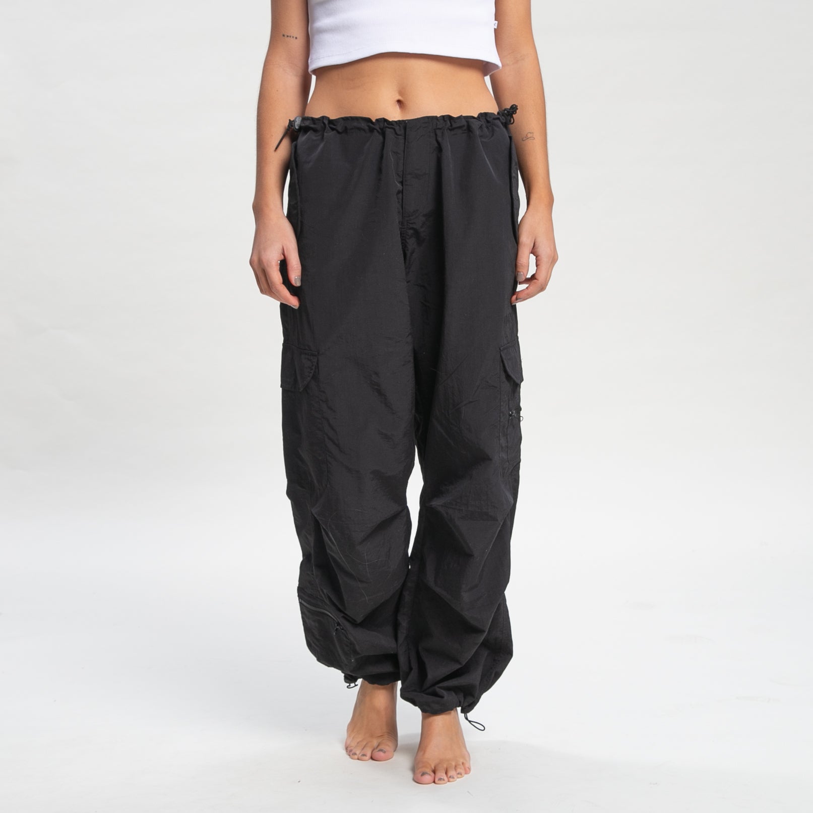 Pantalón baggy fit de tiro bajo con cintura y tobillos ajustable con cordón elástico y tancas. Wide leg y bolsillos tipo cargo. Bordado logo en delantero a contratono.