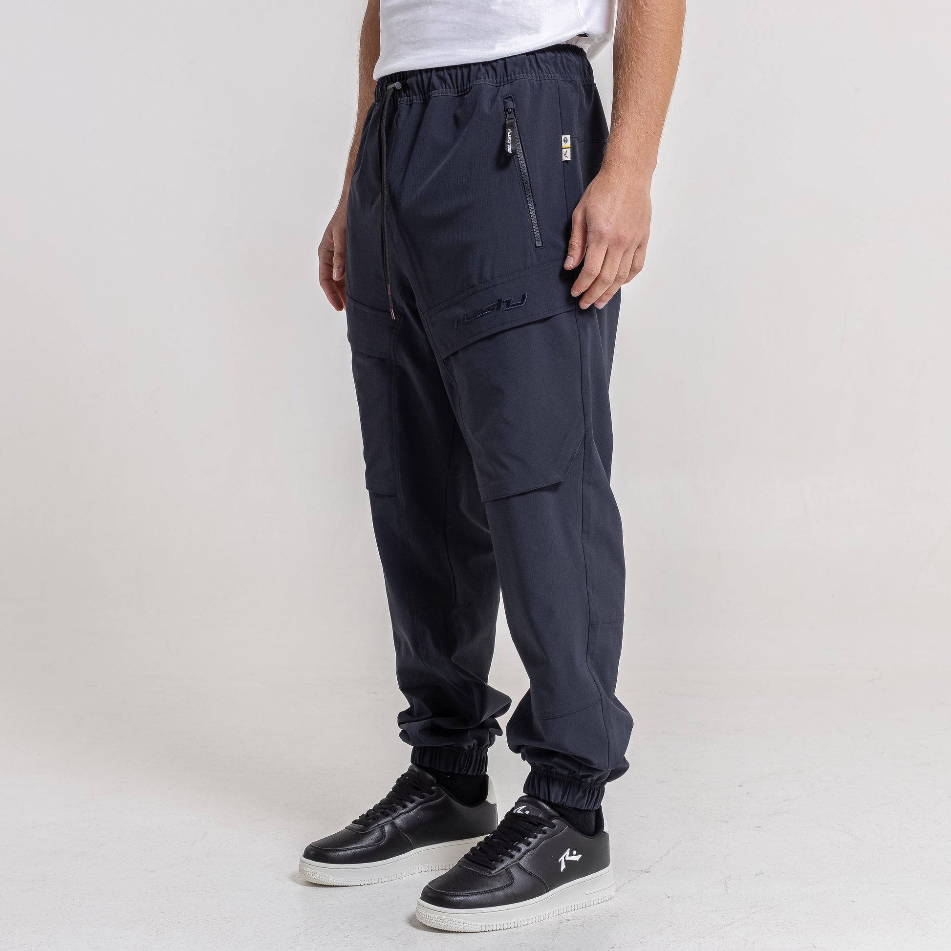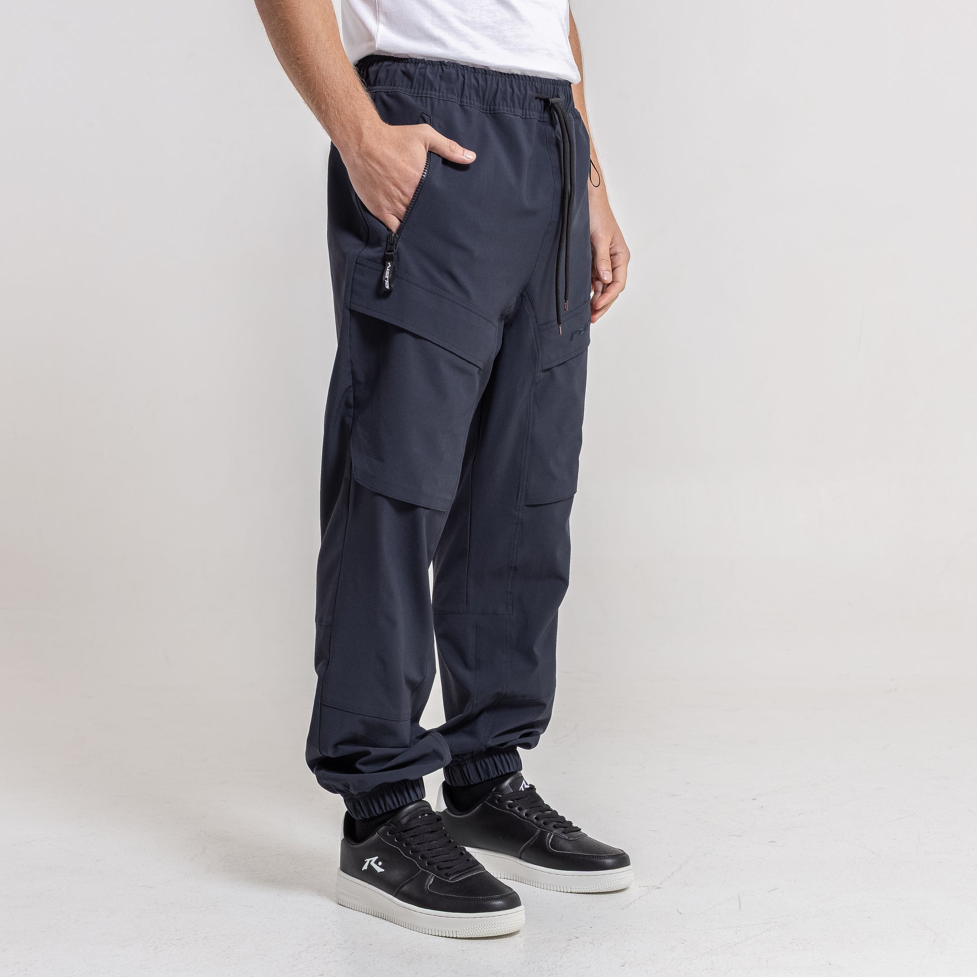 Detalles Cintura ajustable con tanca y cordón. Bolsillos cargo. Logo bordado al tono.
