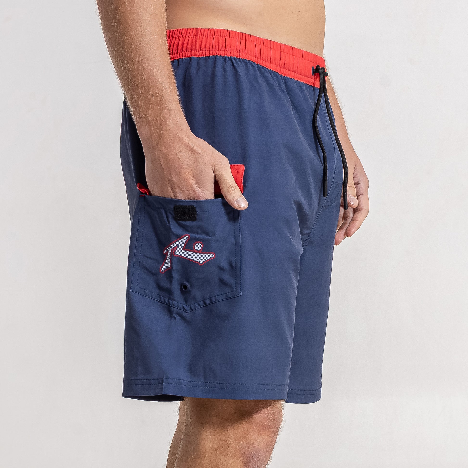 Detalles Cintura elastizada a contratono, con cordón tubular y punteras plásticas personalizadas. Suspensor interno de mesh. Bolsillo plaqué lateral con patch tejido y festoneado. Estampa lateral.
