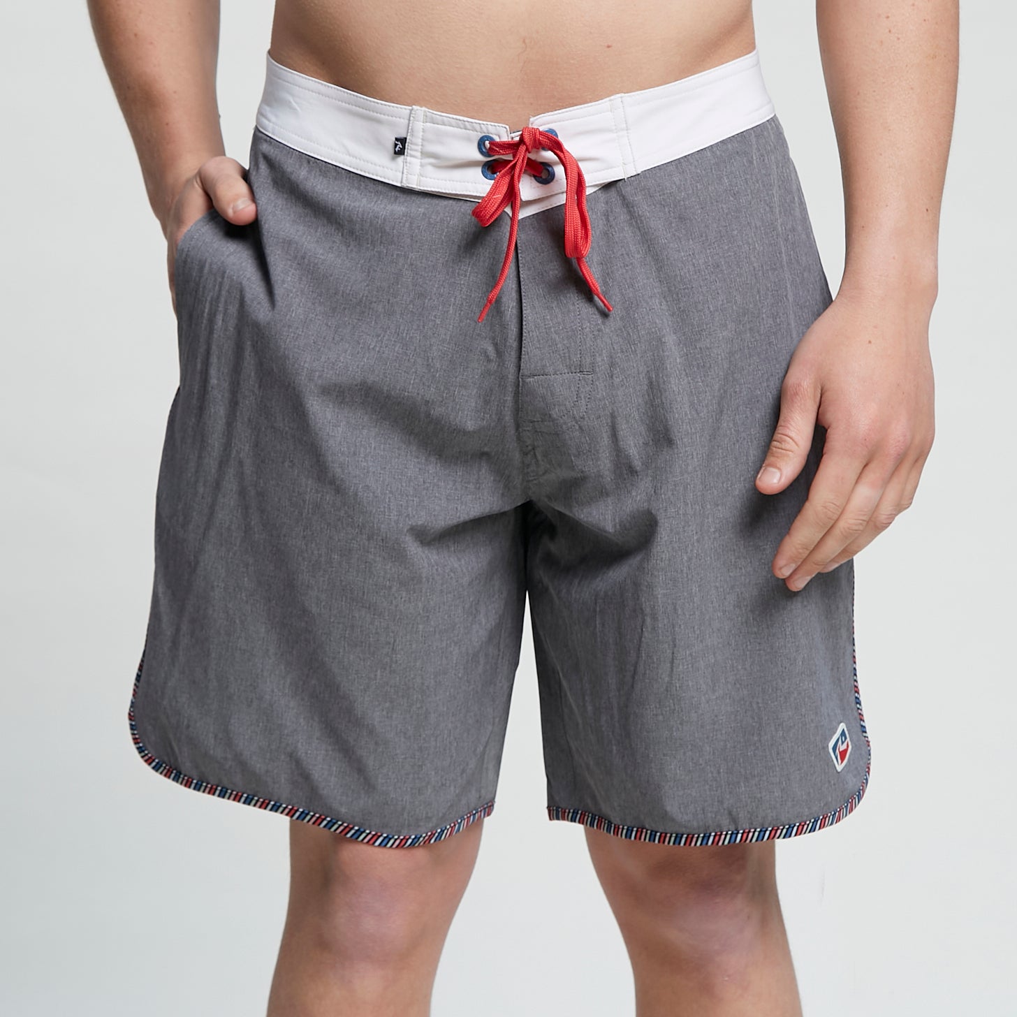 Boardshort de cintura fija a contratono, con cordón chato antideslizante y ojalillos personalizados. Terminación escalopi con evivado multicolor. Bolsillos laterales y trasero ojal con cierre.