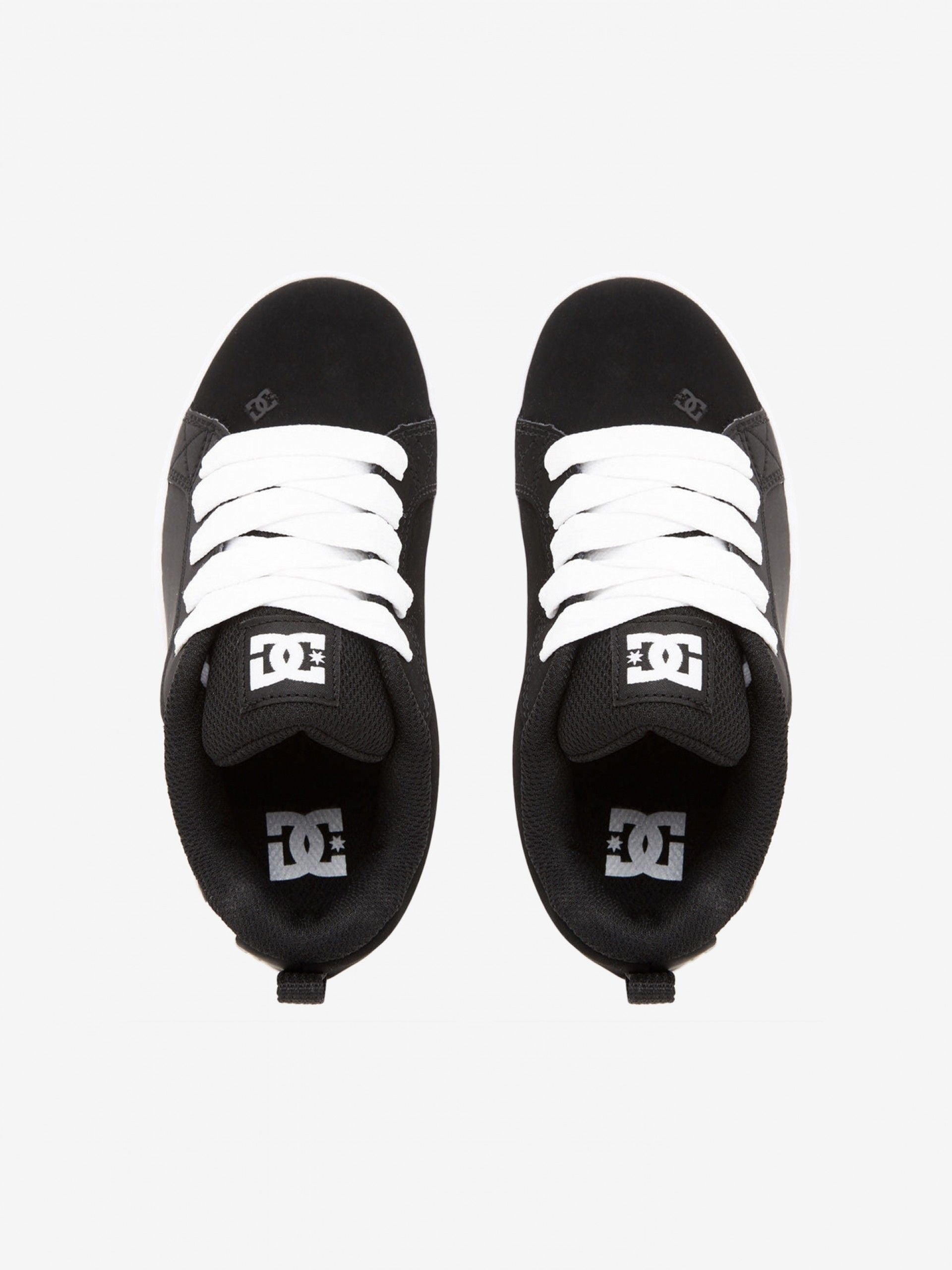 Zapatillas DC Shoes Court Graffik Kids Negras fabricadas con piel y materiales sintéticos y textiles con parte superior en piel nobuk, cuello y lengüeta acolchados en espuma para mayor comodidad y sujeción, forro de malla transpirable y orificios laterales de ventilación.